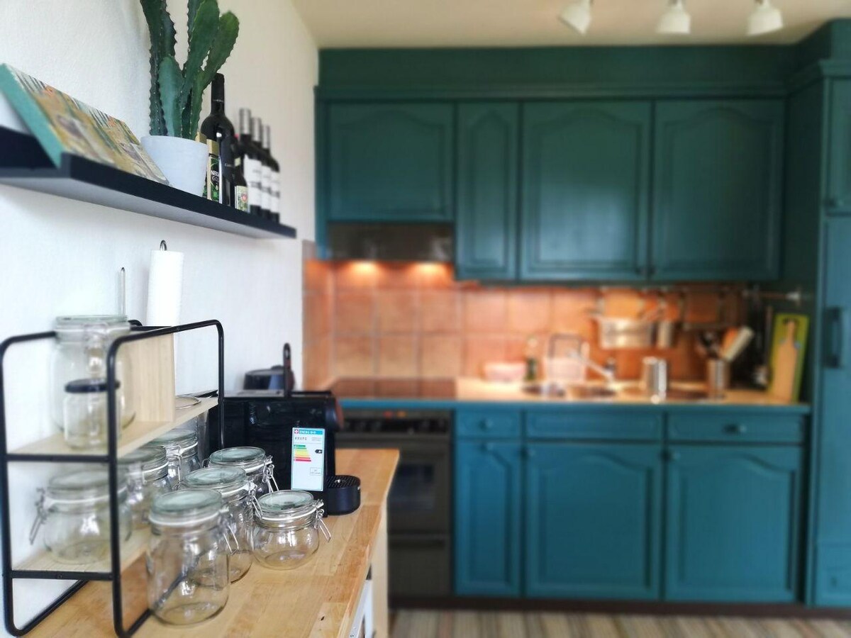 Nuestro apartamento está ubicado al sur, lejos de cualquier tráfico por carretera, donde puedes disfrutar de la noche cómodamente en la terraza en verano, en invierno hay una acogedora chimenea para una noche romántica disponible. En coche, puedes conducir hasta el garaje subterráneo. Se puede acceder al apartamento con ascensor. El aeropuerto y el bienestar están garantizados para ti con el gimnasio gratuito con cancha de tenis, sauna y piscina cubierta.