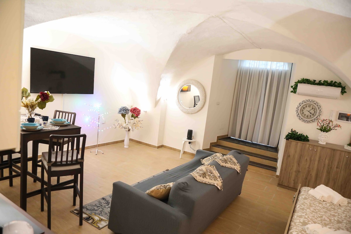 Forte Santa Barbara es un elegante apartamento de 90 m² en el primer piso con una entrada semiindependiente, en un edificio histórico renovado en el corazón de Catania. Los pisos originales, los techos abovedados, las dos terrazas y una espectacular ducha doble ofrecen encanto y comodidad. La calle es peatonal porque debajo del edificio se encuentra la evocadora Tricora romana (siglos II-IV d.C.): aquí literalmente dormirás por encima de la historia de la ciudad.