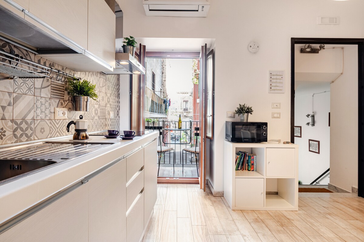 La casa se encuentra en el primer piso de un edificio histórico situado en Via Antonino di Sangiuliano, la calle principal que va desde el mar hasta el centro histórico de Catania. Su ubicación estratégica permite vivir y visitar el centro histórico completamente a pie, ya que está a pocos pasos de los principales puntos de interés de la ciudad, como plazas, monumentos, museos, iglesias, bellezas arquitectónicas, restaurantes, bares y la Via Etnea con sus tiendas.