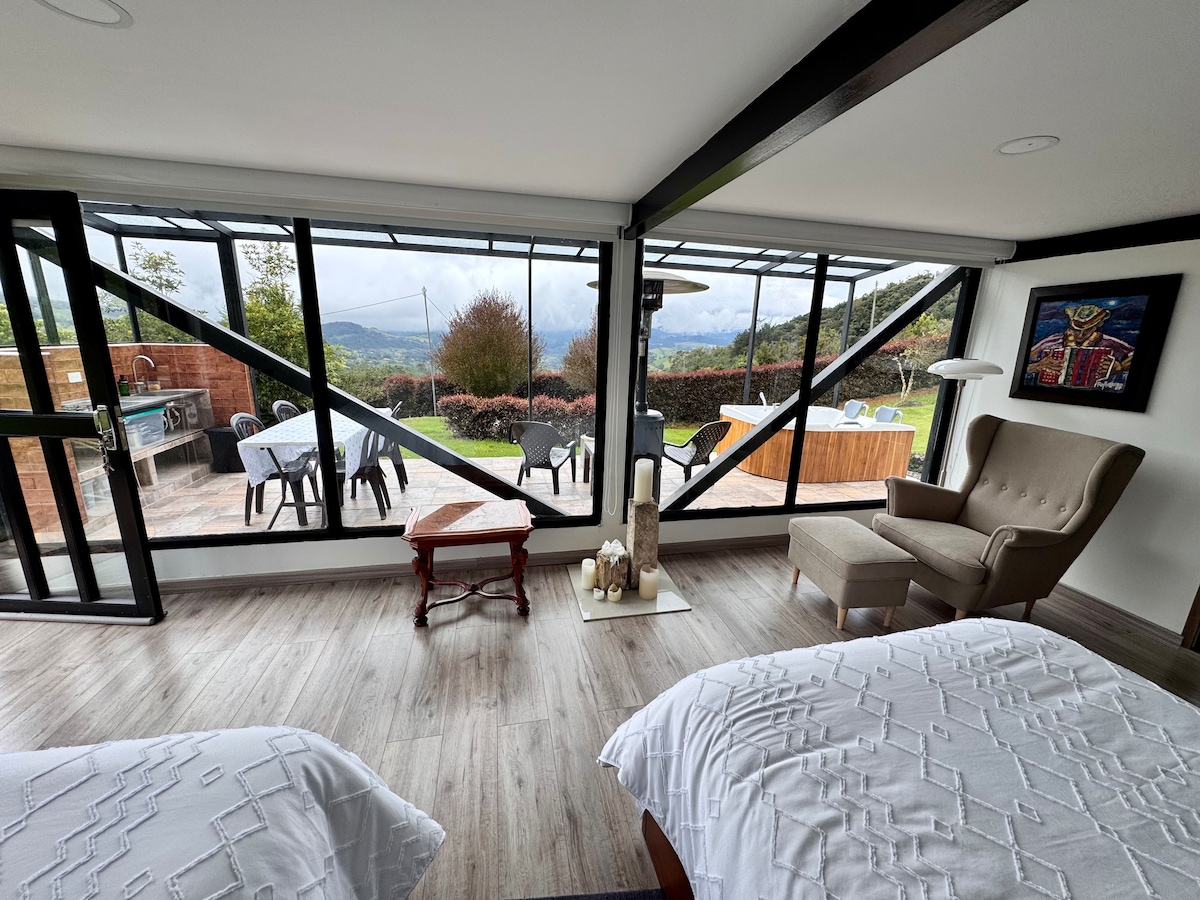 Loft único en Bogotá, cerca de Usaquen y parque 93. Disfrutaras de hermosas vistas a las montañas y parte de la ciudad, amaneceres, atardeceres y hasta arcoíris a través de la enorme ventana de 8m que abre por completo, relájate en el jacuzzi con agua caliente, en la cama con calefacción, la hamaca o el sofá al lado de la chimenea, mientras ves una película en el cinema de 150”. Loft automatizado, baño con ducha de hidromasajes, walking closet amplio y escritorio con wifi 5G y cable ethernet