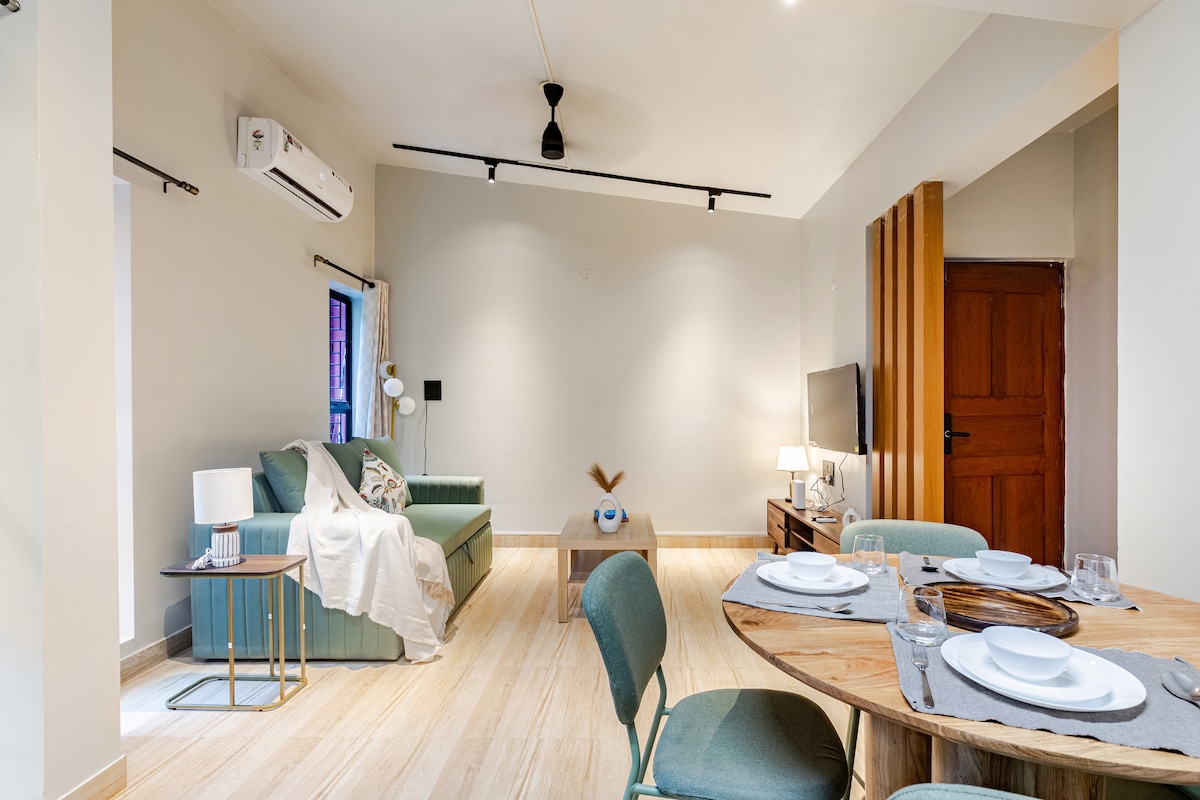 Vaayu, inspirado en el 'Air Element', es un refugio sereno frente al río a lo largo del río Talpona junto con una piscina. Este apartamento de 2 dormitorios combina comodidades modernas con el encanto de Goa de la década de 1970. Relájate en la espaciosa sala de estar, disfruta de las vistas al río desde toda la casa y relájate junto a la piscina rodeada de cocoteros. Con una cocina bien equipada para comidas caseras, este tranquilo santuario ofrece la escapada perfecta para experimentar la belleza atemporal de Goa, la tranquilidad y la conexión con la naturaleza.