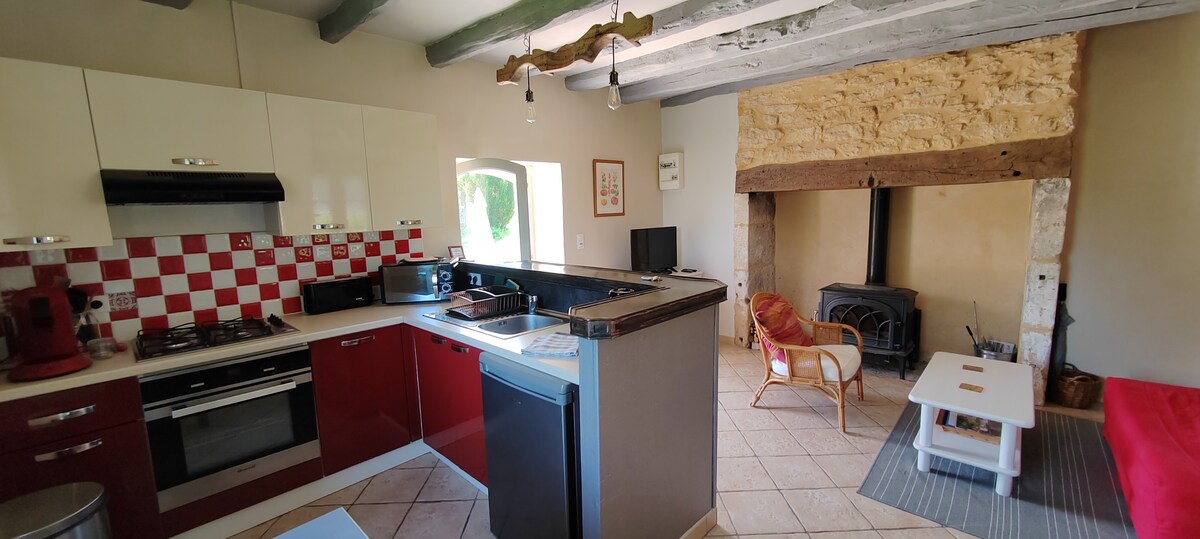 Notre petite grange se compose d'une grande pièce à vivre de 30m² avec coin cuisine, coin salle à manger, coin salon (avec son canapé lit couchage double 140cm), coin nuit (avec son lit en 160) et une salle d'eau avec wc. Vous aurez un coin de jardin privé à votre disposition. Idéale pour 2 personnes, elle peut néanmoins accueillir jusqu'à 4 personnes avec son canapé lit. Chauffage par poêle à granulés. Les granulés sont fournis.