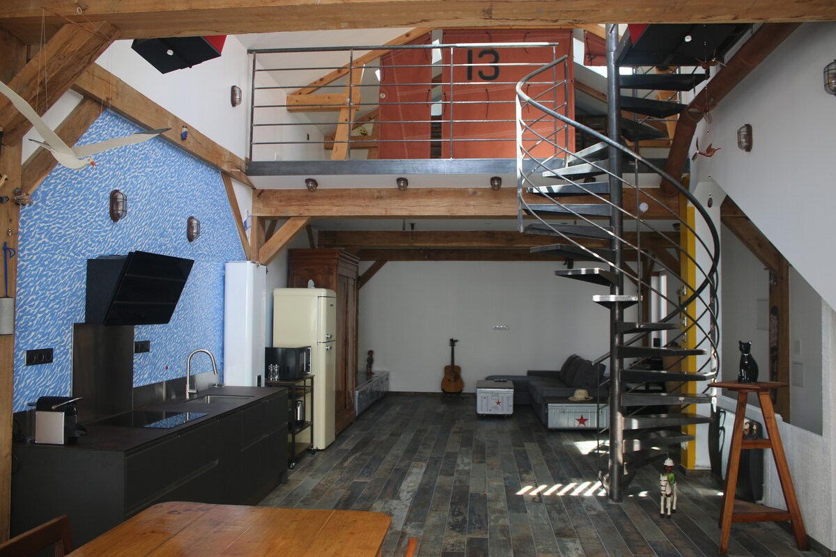 Como una casa en lo alto ¡En el primer/último piso! Alojamiento de 4 habitaciones tipo loft, atípico y artístico ¡Ropa de cama nueva desde 2026! • 4 colchones de verdad (de 2 plazas) • 1 sofá (1 plaza) que puede hacer cama para un niño, por ejemplo • ¡Es decir, de 8 a 9 plazas para dormir!