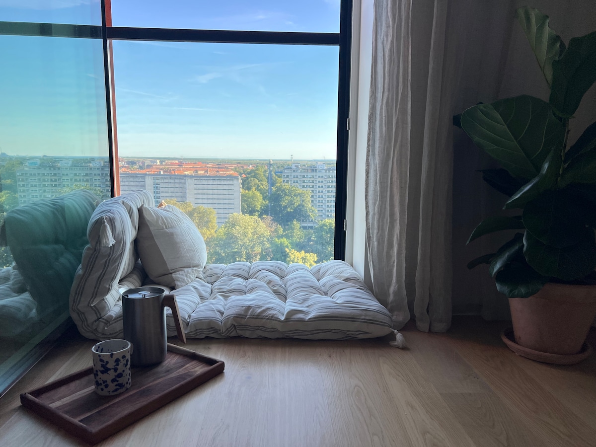 -- Experiencia histórica-- El apartamento está en el nivel superior del edificio residencial más alto de Copenhague, llamado así por el físico danés ganador del premio Nobel Niels Bohr. Se encuentra en el moderno distrito histórico «Carlsberg city», donde estaba la antigua zona cervecera de Carlsberg. La antigua casa de Niels Bohr también se encuentra aquí. Muchos elementos del diseño del apartamento se basan en Niels Bohr. Los huéspedes pueden tener una experiencia de estancia única con la mezcla de diseño moderno y fondo histórico.
