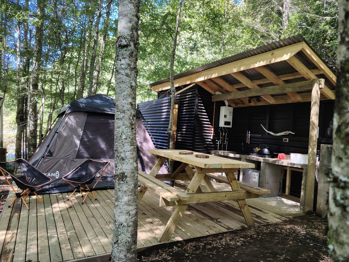 ESTO ES CAMPING 🤩 NO CABAÑA. ⛺️ Valor $9.990 por persona. ¡Disfruta de una experiencia única en plena naturaleza, donde la comodidad y tranquilidad se unen para que disfrutes! Amplias áreas verdes, Áreas comunes con TV, sector de juegos infantiles, baños, duchas con agua caliente, pequeña piscina natural, tinaja caliente, Sector de fogón, Cocina equipada, servicio de lavandería, Wifi, Parrillas, hamacas, kayaks, bicicletas y más. Ven a vivir del sur en el mejor camping familiar de la zona!