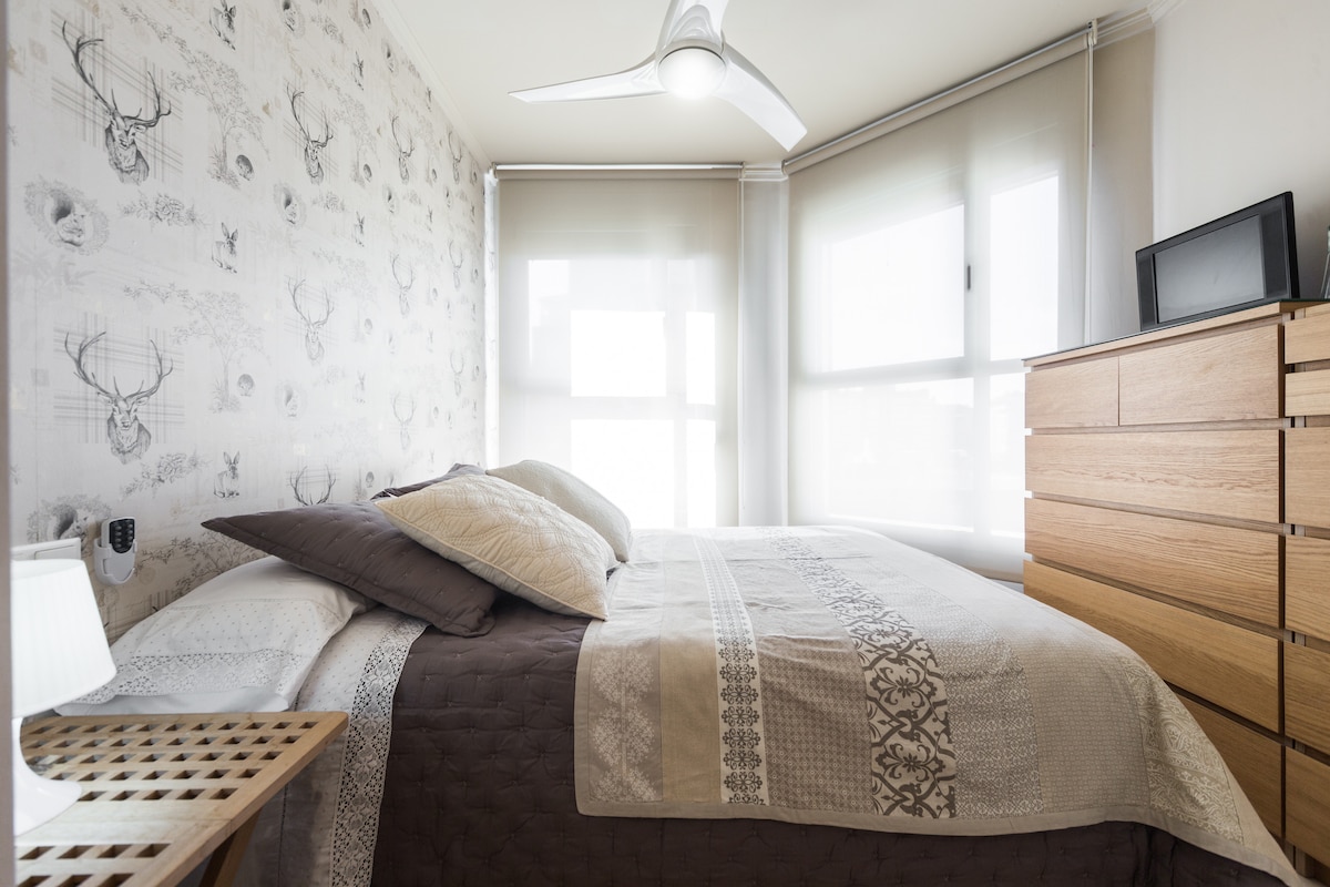 Amazing apartment in the coolest and central Russafa neighborhodd. Newly renovated apartment with and old fashioned look , with wooden original structural beams, mosaic floor on the barhroom, and nude brick walls. 80 squared meter with 2 double bedrooms with wardrobes, and open and fantastic kitchen with everything you can need on it, and a super comfy 4 places sofa with a big smart tv on the living room. nice and lovely views to the trees, fresh and lighty inside, with aircon and heating