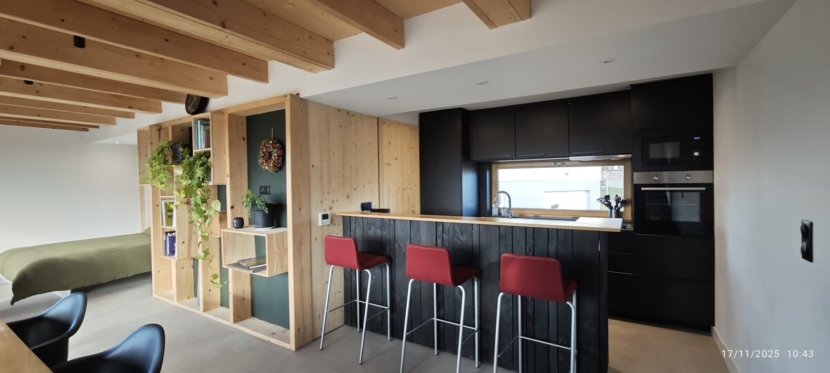 Enjoy a romantic escape in our charming 4-star loft in the heart of Barr, nestled in the courtyard of an 18th-century Alsatian half-timbered house. This spacious and fully equipped haven offers an open-plan kitchen, a cozy living area, a queen-size bed, walk-in shower, separate toilet, dressing room, air conditioning and Smart TV. A tandem is available for two, as well as a charging station for e-bikes and a private garage. A unique, refined, and welcoming place for a truly special stay.