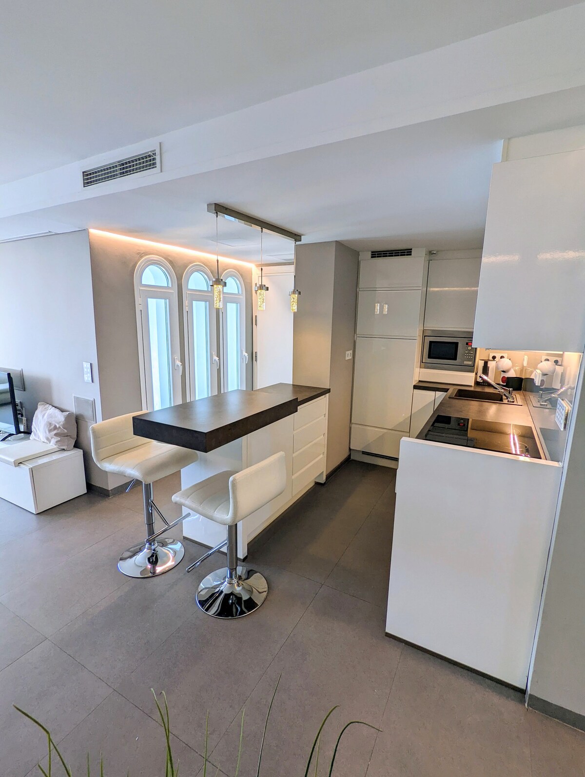 El apartamento reacondicionado 2024 tiene 60 metros cuadrados y es de estilo loft de planta abierta. Es el último apartamento en el quinto piso en la playa con muy bonitas vistas al mar en primera fila. Baño con ducha y bañera. Aire acondicionado central. Cocina con estufa de inducción, nevera, lavavajillas y está totalmente equipada. Todas las ventanas de doble acristalamiento. A poca distancia del Oceano Beach Hotel. WiFi de fibra óptica gratis!