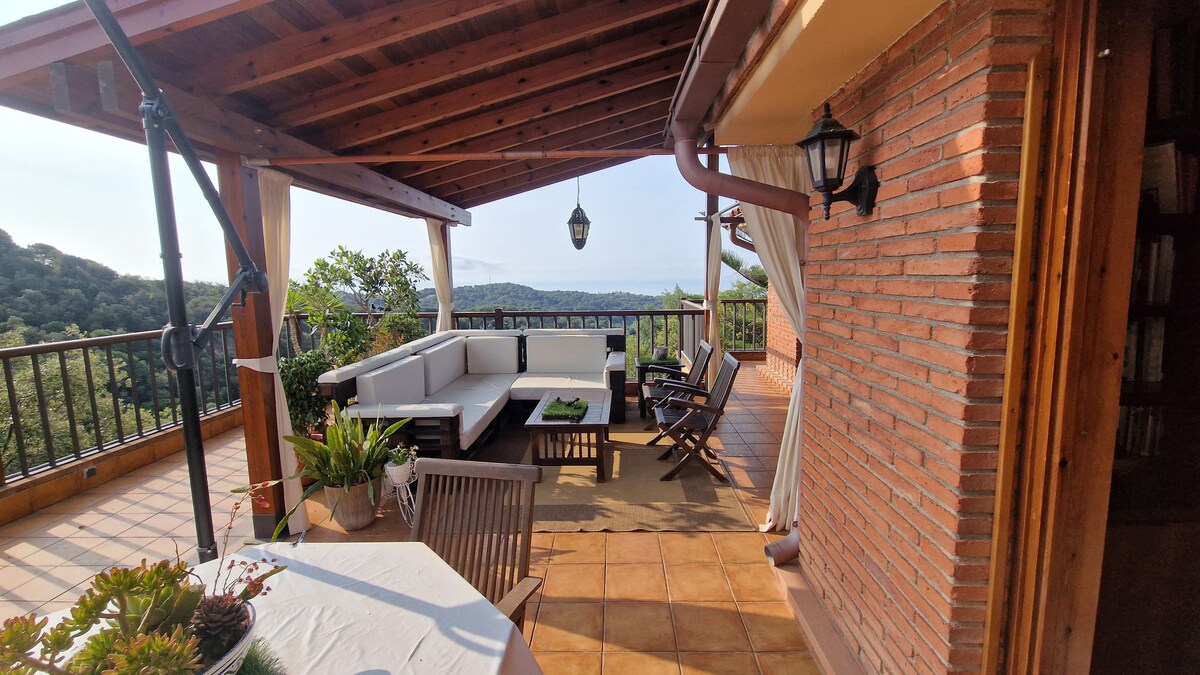 Nuestra casa familiar consta de dos plantas con entradas independientes. Te alojarás en la planta superior de 120 m y podrás disfrutar de unas espectaculares vistas al mar, jardín y piscina que serán exclusivos para tí. Ideal para descansar y desconectar. Situada en el Maresme a 5 minutos de la playa, a 22 km de Barcelona,30 Km del circuito de Montmeló. Tienes rutas BTT, de senderismo, hípica, campos de golf y contamos con la Poma BikePark-Skatepark considerado el mejor de Europa.