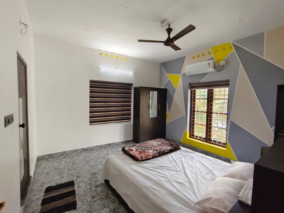 The house has two double Bed rooms with A.C. and attached bathrooms; one with water heater,& a common bath room.Extra double mattress available in one bed room. Spacious hall has dining table with 6 chairs, sofa set and a diwan. Kitchen with work area has fridge, water purifier, cooking facilities etc.Corridor leading to Pooja room and a patio by the side of a central courtyard are ideal for relaxation. All are well ventilated with mosquito nets and for exclusive use of guests.