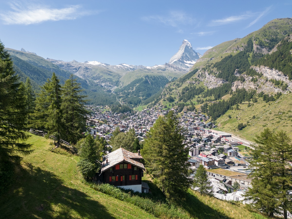 Apartamento comfortable cerca del centro y del aceso a las telecabinas con vista extraordinaria sobre el MATTERHORN (Cervino). Se le puede admirar sin obstruccion desde el dormitorio (inclusive acostado en la cama!), desde el salon y por supuesto desde el largo balcon sobre el cual dan el dormitorio y el salon. Equipado con todas las comodidades modernas incluyendo : wifi privado gratis, 2 grandes pantallas de TV (40''), Bose dock, etc...