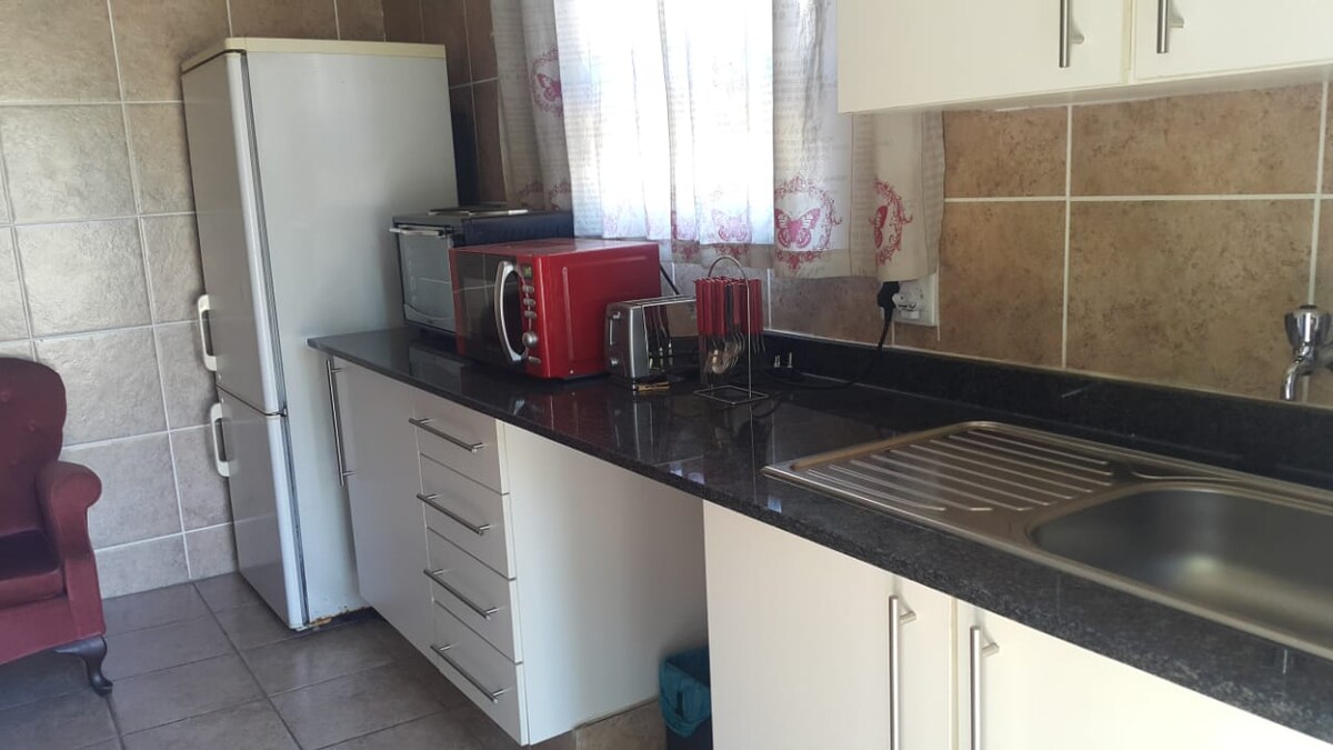 Esta casa de campo autónoma es de 1 cama, 1 baño, con salón y cocina americana. Tiene ventilador de techo, wifi, respuesta armada, TV con caja Android y su propia entrada y aparcamiento. Tiene el uso total de la piscina compartida, las áreas braai y la lavandería incluida [se puede organizar el planchado] Cuenta con su propia agua y estufa/horno de gas. AHORA EN ENERGÍA SOLAR PARA MOLESTIAS DE DESPRENDIMIENTO DE CARGA