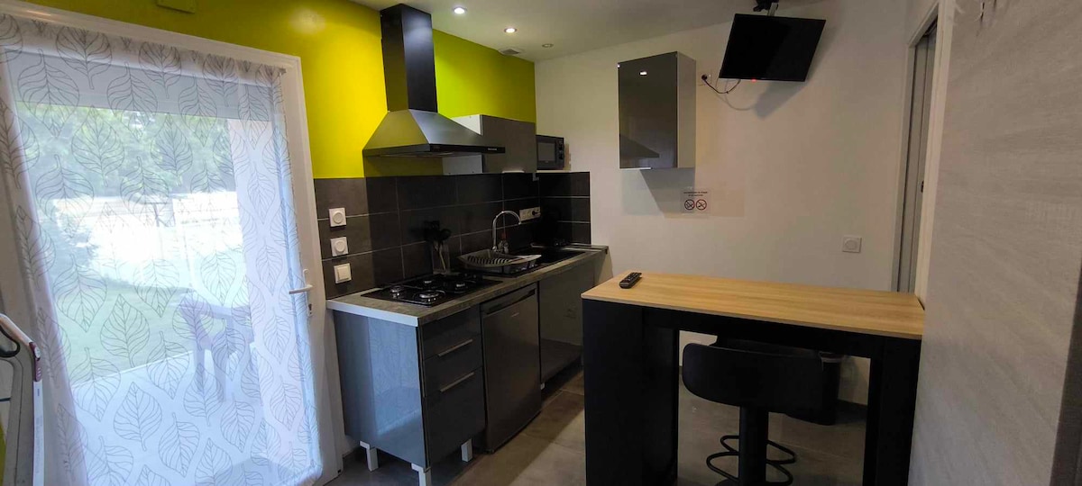 Nous serons heureux de vous accueillir dans ce logement neuf et entièrement équipé situé au rez de jardin de notre maison. Composé d'une chambre (lit 160x200), d'une salle de bain (douche) et d'une cuisine équipée ouverte sur le salon avec canapé-lit (160X200). Draps, serviettes et ménage sont inclus. L'entrée indépendante se fait par la terrasse privative où vous pourrez profiter d'une superbe vue sur les monts du forez. Situé à 5 min des axes autoroutiers. Au plaisir de vous recevoir!