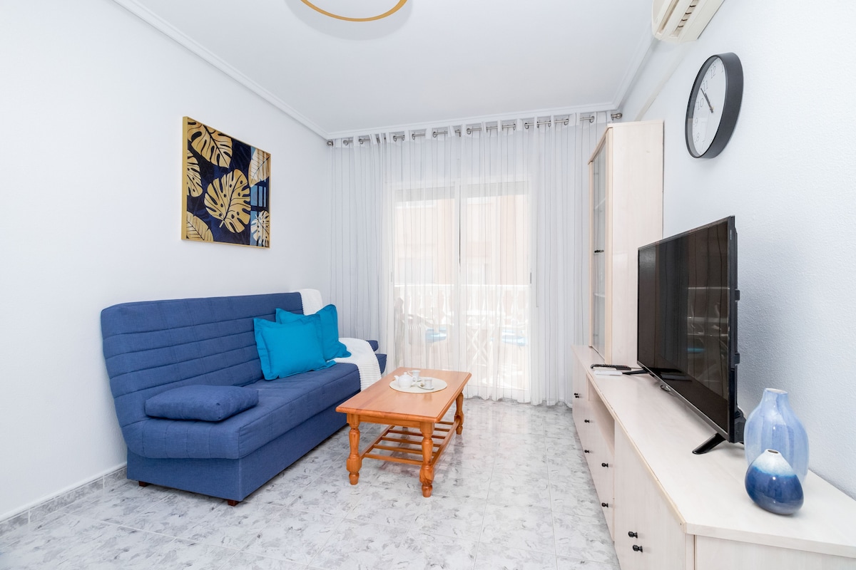 Coqueto apartamento de un dormitorio, salón y cocina americana en el centro de Torrevieja. Piso de 52 m2, 1ª planta de una casa de dos plantas. Hay todos los electrodomésticos, aire acondicionado en la cabina, TV, WIFI.