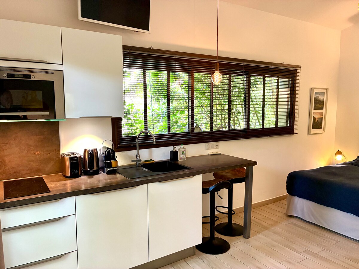 N°13211009294HT Encantador monoambiente con aire acondicionado equipado con fibra óptica con pequeña piscina y SPA de masajes de 2 plazas Consta de una zona de cocina y comedor, una cama doble y un baño, pero también un jardín, horno de pizza, parrilla, freidora, servicio de lavandería, plancha y tabla de planchar. A 500 m del centro comercial, a 3 km de las colinas de Pagnol, cerca del acceso a la autopista 1 min: Cassis (15 min), centro de la ciudad de Marsella (15 min). Playa del Prado (8 km) y de nuestras hermosas calas, Autobús cerca