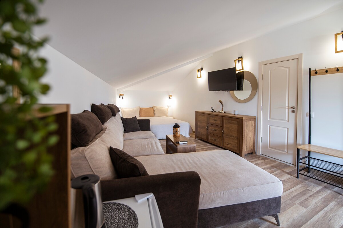 Люкс Suite Roma 2 в Spa Club Bor – крупнейшем 4-звёздочном бальнео-отеле Велинграда, сертифицированном Европейской спа-ассоциацией. Отель расположен в сосновом парке на месте древнеримских терм. Люкс сочетает современный комфорт и богатую историю региона. Гости наслаждаются первоклассными удобствами, спокойной атмосферой и уникальными природными ресурсами Велинграда – столицы спа-туризма Болгарии.
