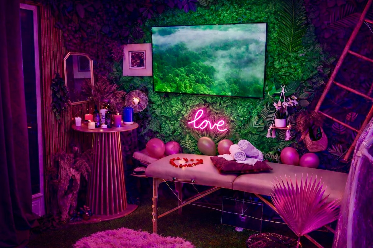 ✨ Descubre el Mirage Tropical, un paréntesis refinado a orillas del Loira 🌴. Disfrute de un spa, una mesa de masajes, una elegante terraza y un exótico espacio selvático para escapar. Diviértase jugando a los dardos, comparta un aperitivo exótico o relájese en un ambiente único. Por la noche, la habitación se ilumina con colores cautivadores para un momento elegante y romántico💖. Aquí, cada detalle sublima su estadía para crear recuerdos memorables.🌴❤️❤️💕💕💕👄🫂❤️