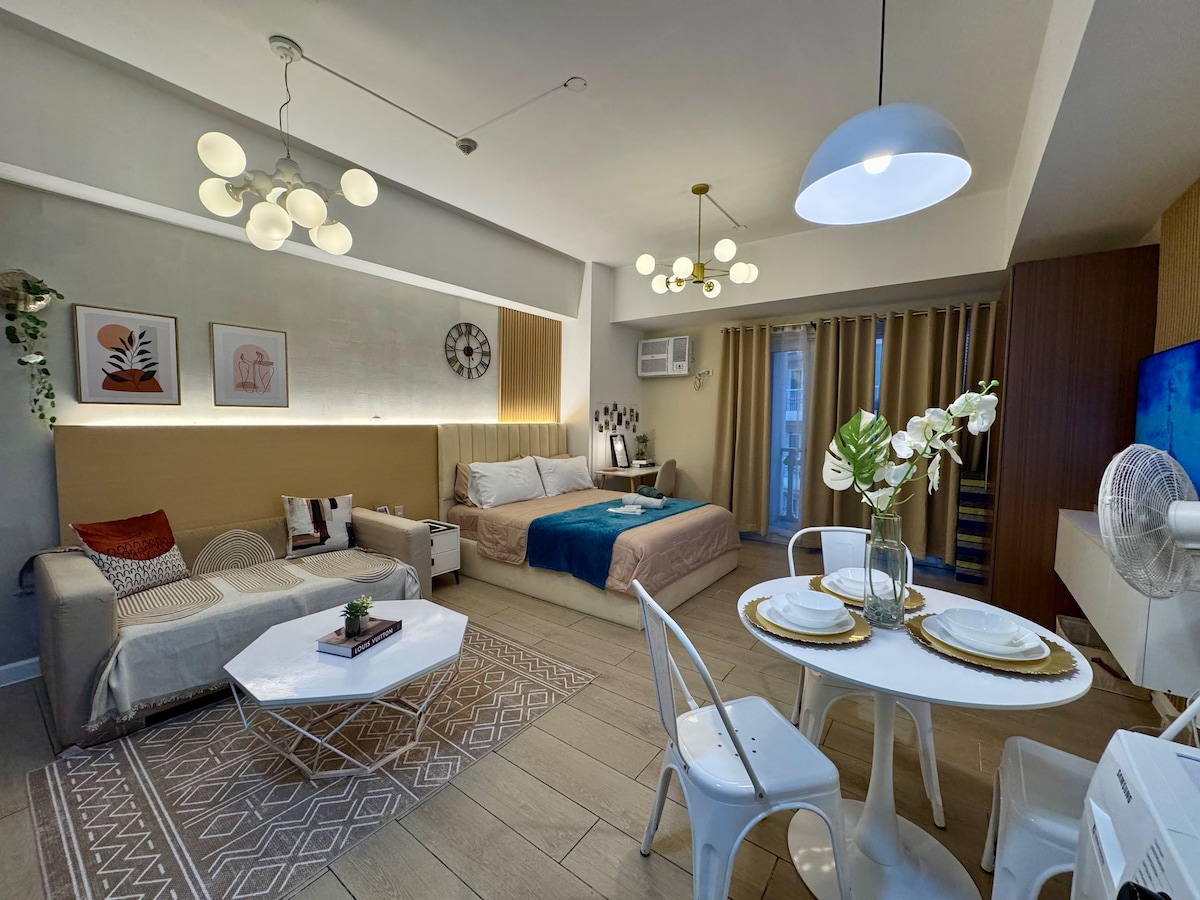 Vive, relájate y explora, justo al lado del icónico centro comercial Venice Grand Canal. Este acogedor estudio, situado en el piso 16, mide 41 metros cuadrados y cuenta con un balcón privado que ofrece una hermosa vista del jardín y el cielo, perfecto para tu café de la mañana o para relajarte por la noche. Comodidad a la vuelta de la esquina: LAWSON está al otro lado del edificio. A 2 minutos de Starbucks y otras cafeterías en el centro comercial. Cine en el centro comercial, juegos para niños y diversas opciones gastronómicas Además, a solo 10 minutos de Bonifacio Global City.
