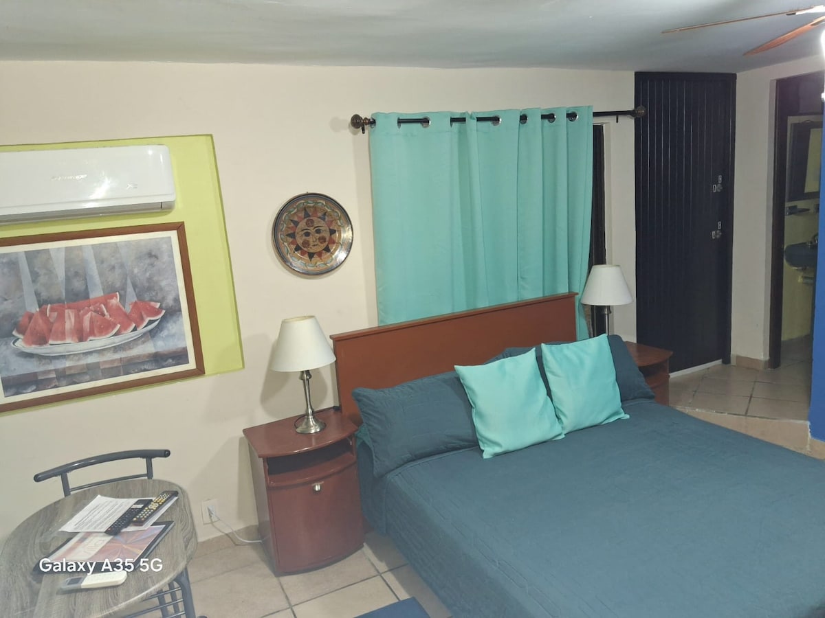 Mini casa completa en planta baja, ideal para parejas, trabajadores o estudiantes. Ubicada en la zona centro turística de Veracruz, a solo 2–5 minutos caminando del mar. Cuenta con cama matrimonial, aire acondicionado en todo el alojamiento, wifi y agua caliente. Cocineta equipada con estufa eléctrica, refrigerador, cafetera y utensilios básicos. Excelente limpieza, atención rápida y zona tranquila, cerca del malecón, playas y transporte. Ideal para descansar con buena relación calidad-precio.