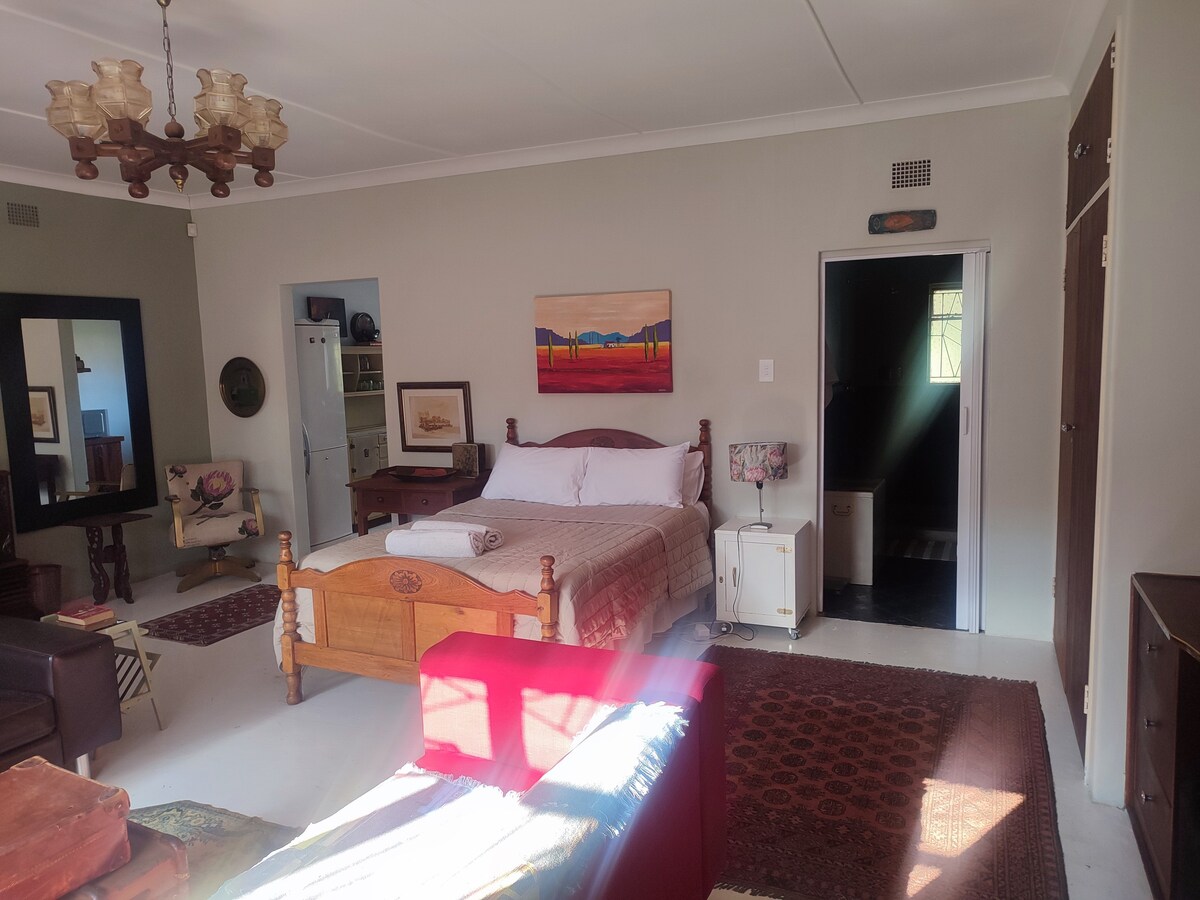 Esta casa de campo autónoma es de 1 cama, 1 baño, con salón y cocina americana. Tiene ventilador de techo, wifi, respuesta armada, TV con caja Android y su propia entrada y aparcamiento. Tiene el uso total de la piscina compartida, las áreas braai y la lavandería incluida [se puede organizar el planchado] Cuenta con su propia agua y estufa/horno de gas. AHORA EN ENERGÍA SOLAR PARA MOLESTIAS DE DESPRENDIMIENTO DE CARGA