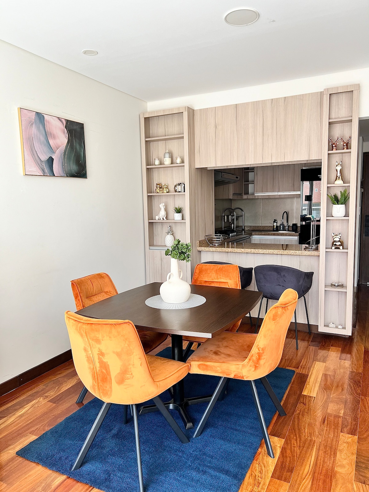 El departamento es encantador! La habitación cuenta con material de línea hotelera para un descanso confortable, la cocina y sala cuentan con todas las comodidades necesarias. La iluminación es perfecta! El departamento se encuentra en una zona completamente segura y centrica, a pasos de supermercados, embajadas, hospitales, bancos, cine, estaciones de teleférico, cafeterías, centros comerciales, bares de rock, discotecas, etc.