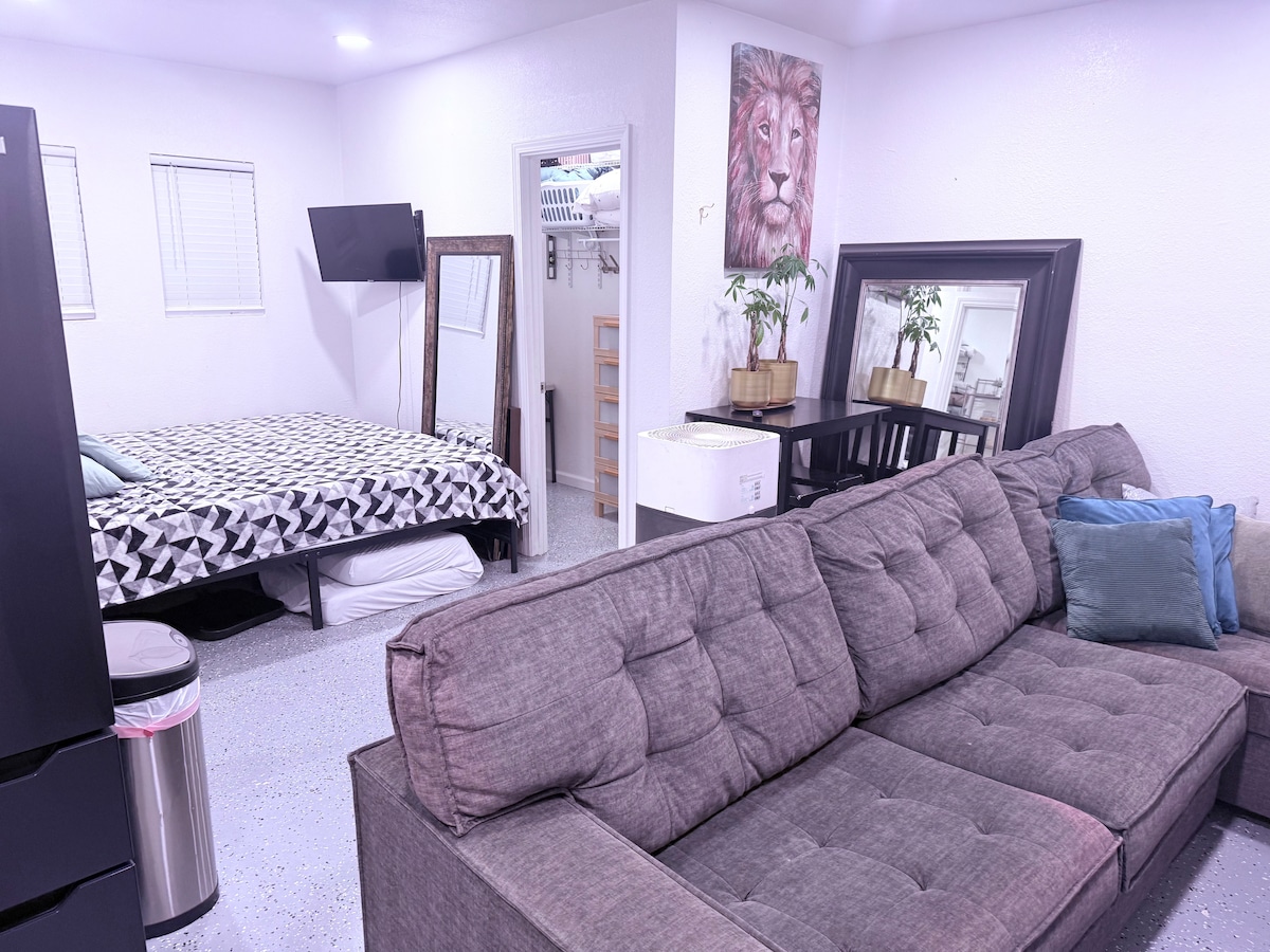 Suite de invitados 1BR/1BA ~ 350 pies cuadrados Entrada privada (entrada sin llave) Termostato personal Aperitivos, bebidas y artículos de tocador de cortesía Colchón Pedic Queen Tempur con base ajustable Televisor inteligente de alta definición de 65 pulgadas en la sala de estar Televisor inteligente de alta definición de 55 pulgadas en el dormitorio Mini refrigerador Estufa doble eléctrica Máquina Keurig Juegos de mesa Escritorio