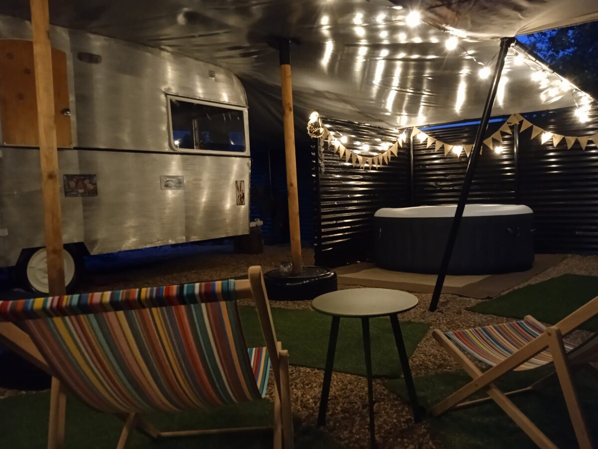 Coole boomtent met retro caravan