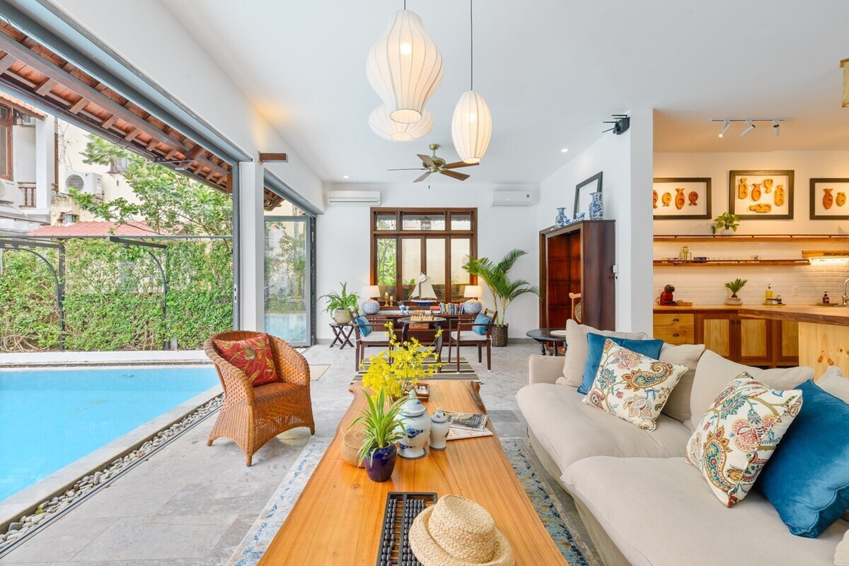Escondida en el corazón de H ! i An, en el centro de Vietnam, esta serena villa de 5 dormitorios es tu escapada privada en medio de interminables campos de arroz, donde pastan búfalos de agua y bandadas de aves blancas que pasan volando . A solo 2 km de la ciudad antigua de H ! i An y de la playa de An Bang, ofrece vidrio del suelo al techo, interiores de madera natural, piscina privada y vida de planta abierta. Un refugio perfecto para retiros conmovedores, reuniones alegres o celebraciones significativas, donde cada amanecer se siente como una bendición.