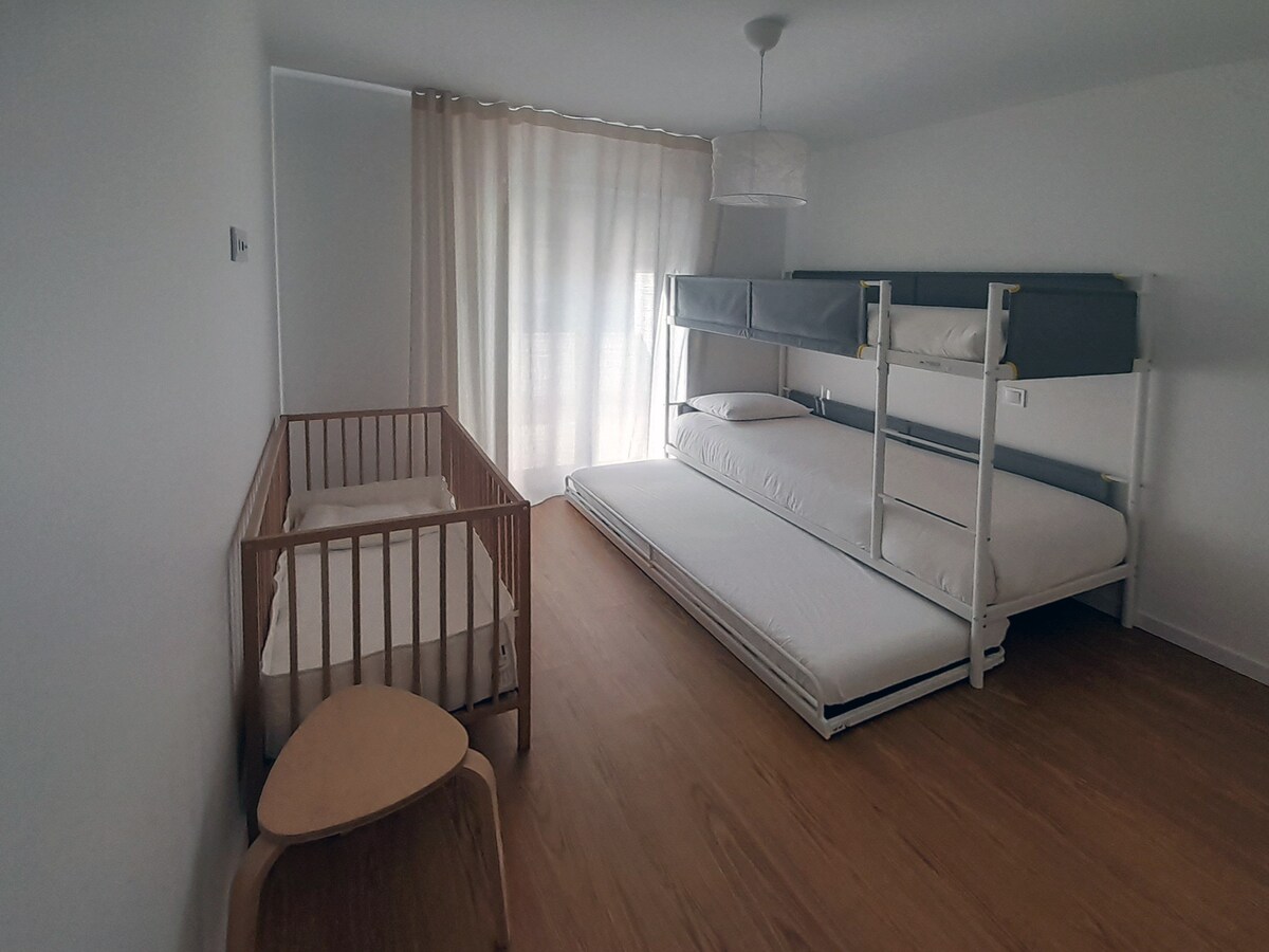 Apartamento en el centro de Arcos de Valdevez - Rua do Lira. A dos pasos de la playa del río, restaurantes, supermercado y tiendas y servicios. Apartamento luminoso, con decoración sobria y perfectamente adaptado para familias. 2 dormitorios (cama doble 160 cm, litera triple) Aire acondicionado, TV, Wi-Fi, silla de cama/bebé, lavadoras/secadoras, vajilla y café, secador de pelo, ropa de cama y toallas. Estacionamiento público gratuito frente a la casa y cerca.