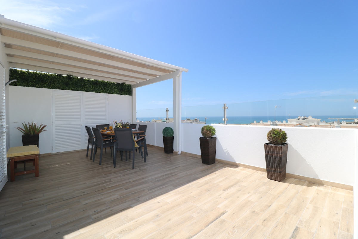 Precio especial para largas estancias. Dúplex, en un 7º y último piso. Compuesto por 2 dormitorios, 2 baños, uno de ellos en suite en el 8º piso con escaleras exteriores. Terraza con fabulosas vistas al mar. Sala de estar y cocina en espacio abierto, aire acondicionado y TV por cable, cocina con lavavajillas y lavadora, microondas, cafetera americana y expreso, tostadora, nevera, placa y horno. Renovado en 2021, con una decoración moderna, garantizará todas las comodidades y una estancia inolvidable.