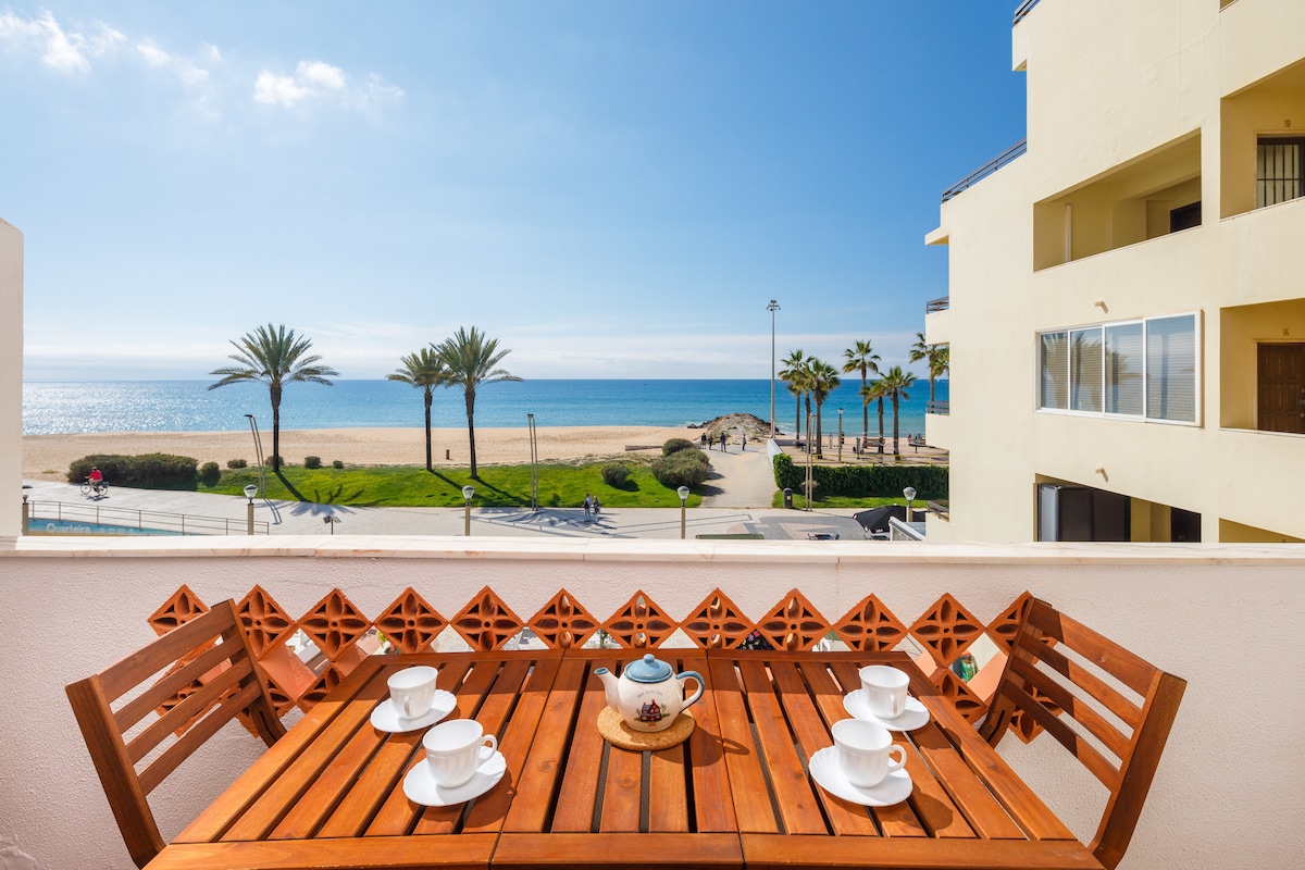 Beautiful beach apartment with a sea view in Quarteira. The beach is 50m away. The apartment is designed for families with children and includes family-friendly facilities, including a wonderful children's bunk bed. A rental car is unnecessary for this location. Supermarkets, restaurants, cafes, and playgrounds are nearby. Enjoy walks to Faro or even Albufeira. We speak English, German, Portuguese and Spanish :)