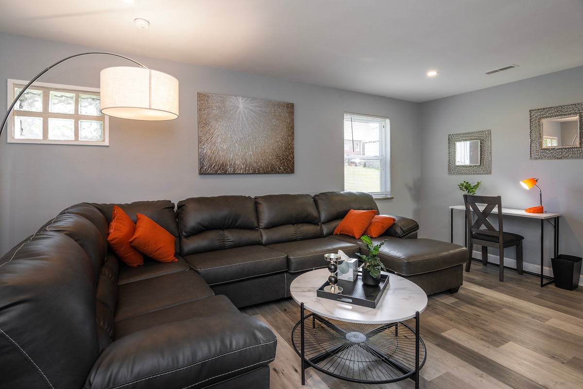 Tranquila, encantadora y cómoda suite de tres habitaciones con chimenea. Wifi de alta velocidad. Incluye nevera con alimentos y bebidas para el desayuno. Complemento completo de servicios. Disfruta del acceso al patio trasero y a la parrilla. El baño exclusivo para huéspedes está justo fuera de la puerta de la suite. Se incluye el cuarto de la colada para tu comodidad y el lavavajillas. Nuestro alojamiento se encuentra a pocos minutos de los estadios de los Reds del centro, museos y restaurantes, Smalley Park, etc. Newport y Covington KY están a 7 minutos en coche.