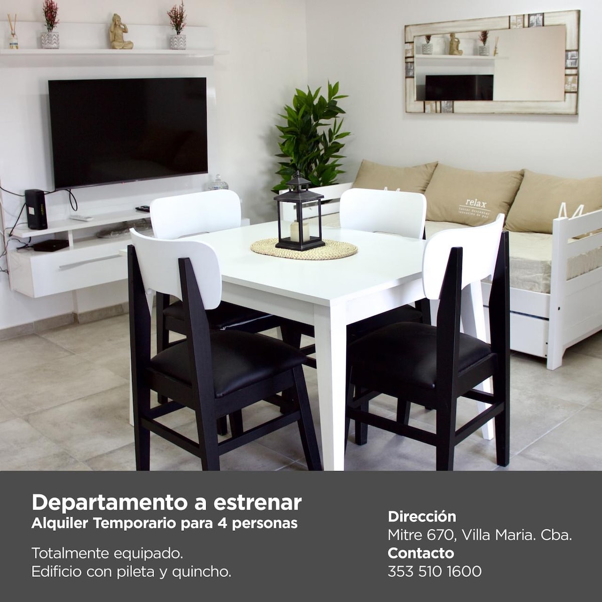 Departamento cómodo y luminoso en el centro de Villa María, a pocos minutos de la terminal. Ideal para hasta 3 huéspedes. Cuenta con habitación privada, baño completo, cocina equipada, WiFi, aire acondicionado, Smart TV y lavarropas. El edificio dispone de pileta y quinchos para disfrutar durante la estadía. También tiene balcón y un espacio cómodo para descansar.