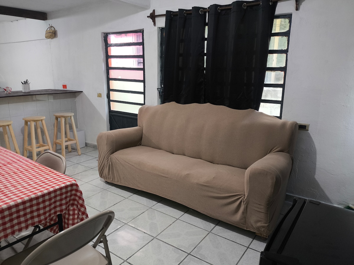 Pequeña habitación hasta para 2 personas se encuentra en un 3 nivel. Esta en un condominio de 3 departamentos con acceso limitado y seguro. La habitación cuenta cama matrimonial, Buro con lámpara, aire acondicionado, ventilador de techo, smart tv de 32”, barra / escritorio con frigobar, microondas, licuadora, parrilla eléctrica, vajilla, cubiertos y vasos para 2 personas, olla y sartén, baño con closet.