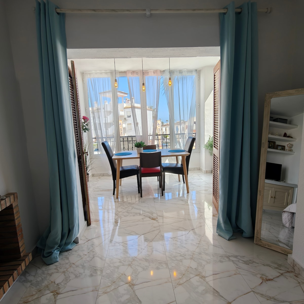 Bonito bungalow con vistas al mar, totalmente renovado y decorado con mucho cuidado. Todo el mobiliario es nuevo. Sala de estar, comedor, 2 dormitorios con armarios empotrados. 3 terrazas muy grandes, una magnífica piscina comunitaria. A menos de 5 min de dos de golfos internacionales “Villamartin Golf” y “Real Club Golf Campoamor” y a 10 min de los golfos “Las Colinas Country Club” y “Las Ramblas Golf”. A 3 km de la magnífica Playa de la Zenia y a 2 km del Shoping Center Zenia Boulevard.