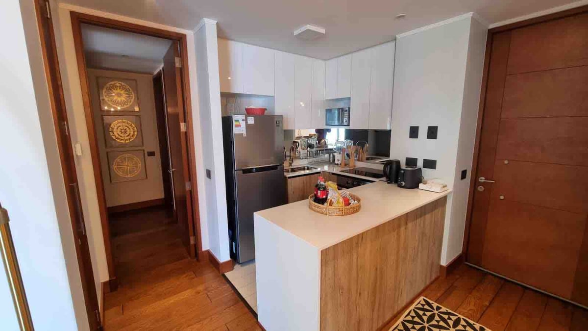 Elegante departamento completamente equipado, con 3 dormitorios, principal en suite, 2 baños, terraza con quincho, parrilla, WiFi, 2 smartTV, cafetera nespresso, estacionamiento techado, piscina cercano a centro de Ski.