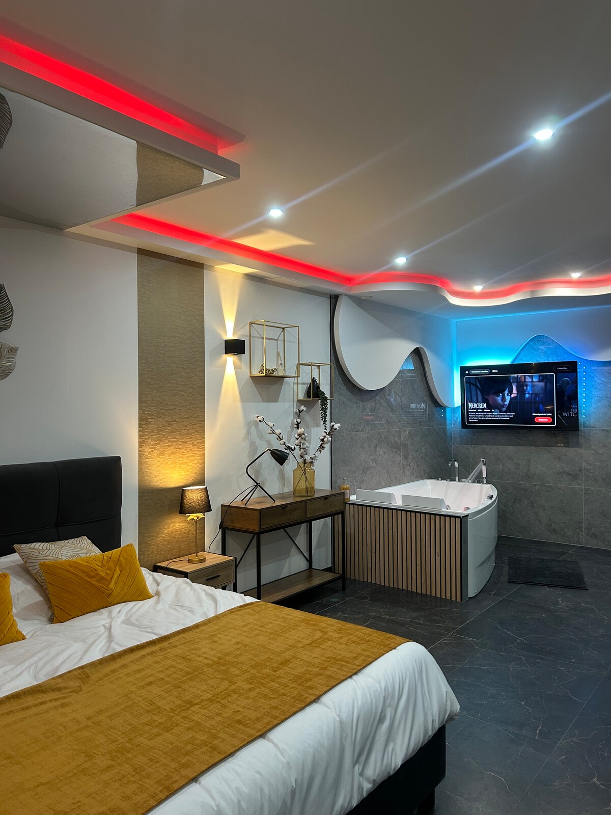 The Cloud ¡☁️Suite de lujo en el corazón de Troyes! Regálese una noche fuera del tiempo en una burbuja de comodidad, diseño y sensaciones. 💎 Cama King Size 5* para flotar como Sangoku en su stratus 🚿 Ducha sensorial en pareja 🕹️ Máquina de arcade con 8000 juegos 🎬 Cine 4K inmersivo, ¡incluso durante el día! 🌳 Columpio colgante con vistas a los árboles 🛋️ Sofá nube sublimado por una aurora boreal LED 🧳 Reserve su escapada celestial y déjese llevar por las nubes