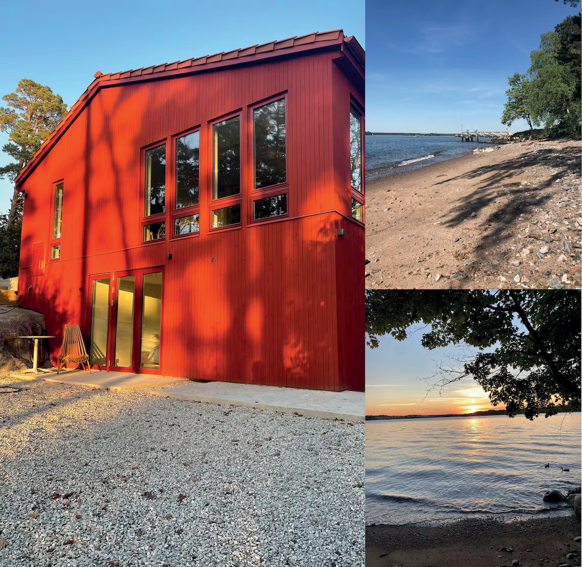Esta casa está justo al borde del agua. 63 metros cuadrados. Muy tranquilo, perfecto para pasar un fin de semana romántico. Enciende un fuego, date un baño en el jacuzzi junto a la casa, escucha las olas y bebe una copa de vino. Cena al atardecer. Sumérgete en el mar Báltico desde el muelle después del jacuzzi. Mira pasar los transbordadores y yates. Cerca de la pista de esquí en Estocolmo. A 20 minutos de la ciudad de Estocolmo en coche, o coge un autobús o un ferry. O haz un recorrido por el archipiélago. Se incluyen 1 kayak doble y 2 kayaks individuales.