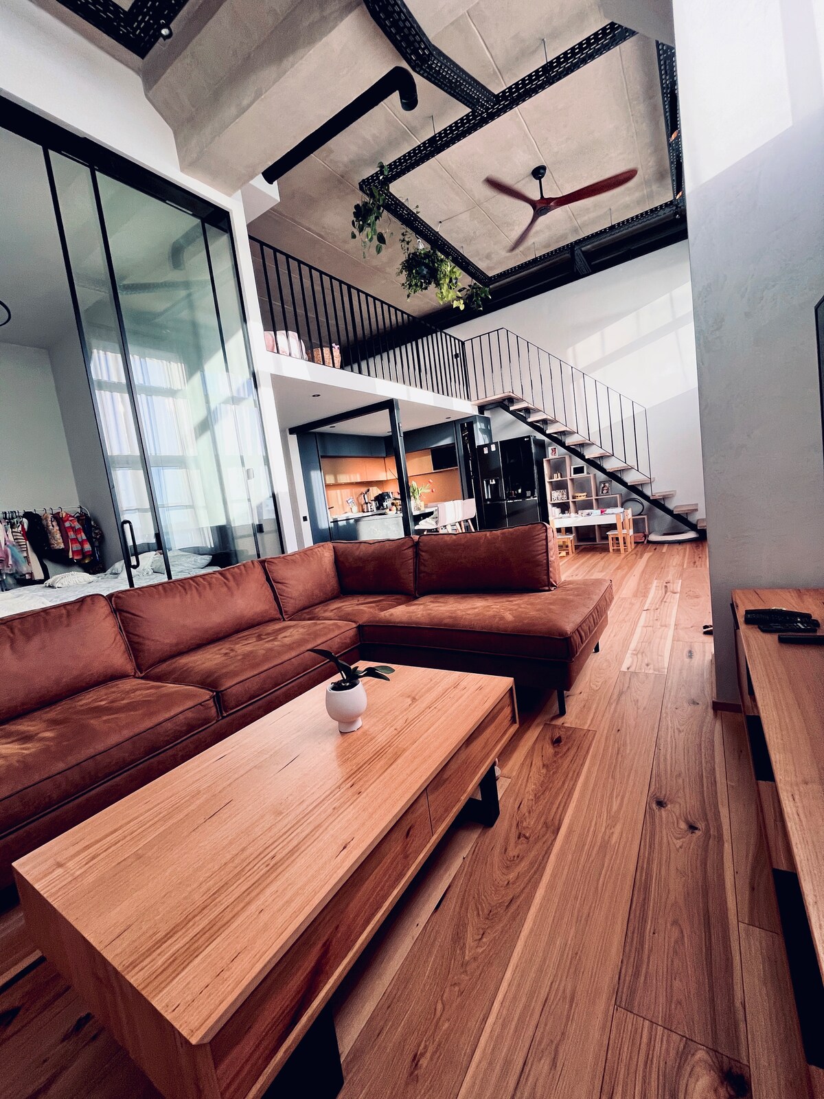 Ground floor apartment with lake access and your own terrace. It is an old factory building with over 4m high ceilings and with a large loft. It is a modern apartment with air conditioning, heated floors, filtered ventilation system and a 1.7m wide ceiling fan. All areas are open and there's a central kitchen with all new appliances and quartz countertops. 65" TV with hundreds of channels. It also has a large bathroom with sauna and washing machine. Rooms can be adjusted to fit your needs