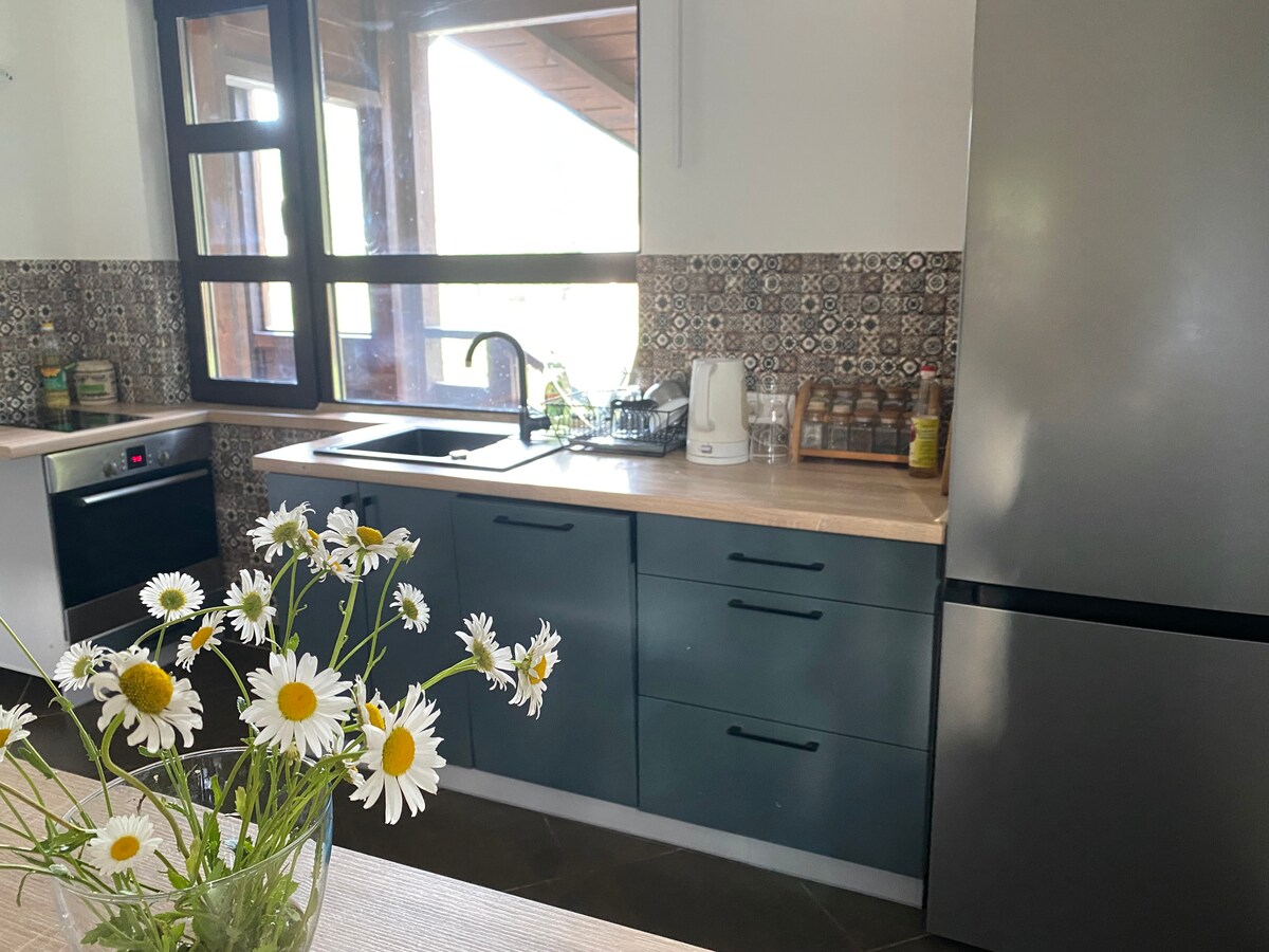 KOSULI — una casa en la naturaleza cerca de los molinos de viento, con un panorama de las montañas. Estacionamiento gratuito en las instalaciones. Un dormitorio separado con una cama matrimonial. También hay un sofá para dos personas. Chan con jacuzzi, piscina en verano. Parrilla, leña. Dos terrazas. Chimenea en la casa. Baño con ducha y lavadora (uso por acuerdo). Cocina: nevera, microondas, cafetera con máquina de capuchino (debes traer tu propio café) y todos los utensilios necesarios. Fácil acceso en auto a la casa