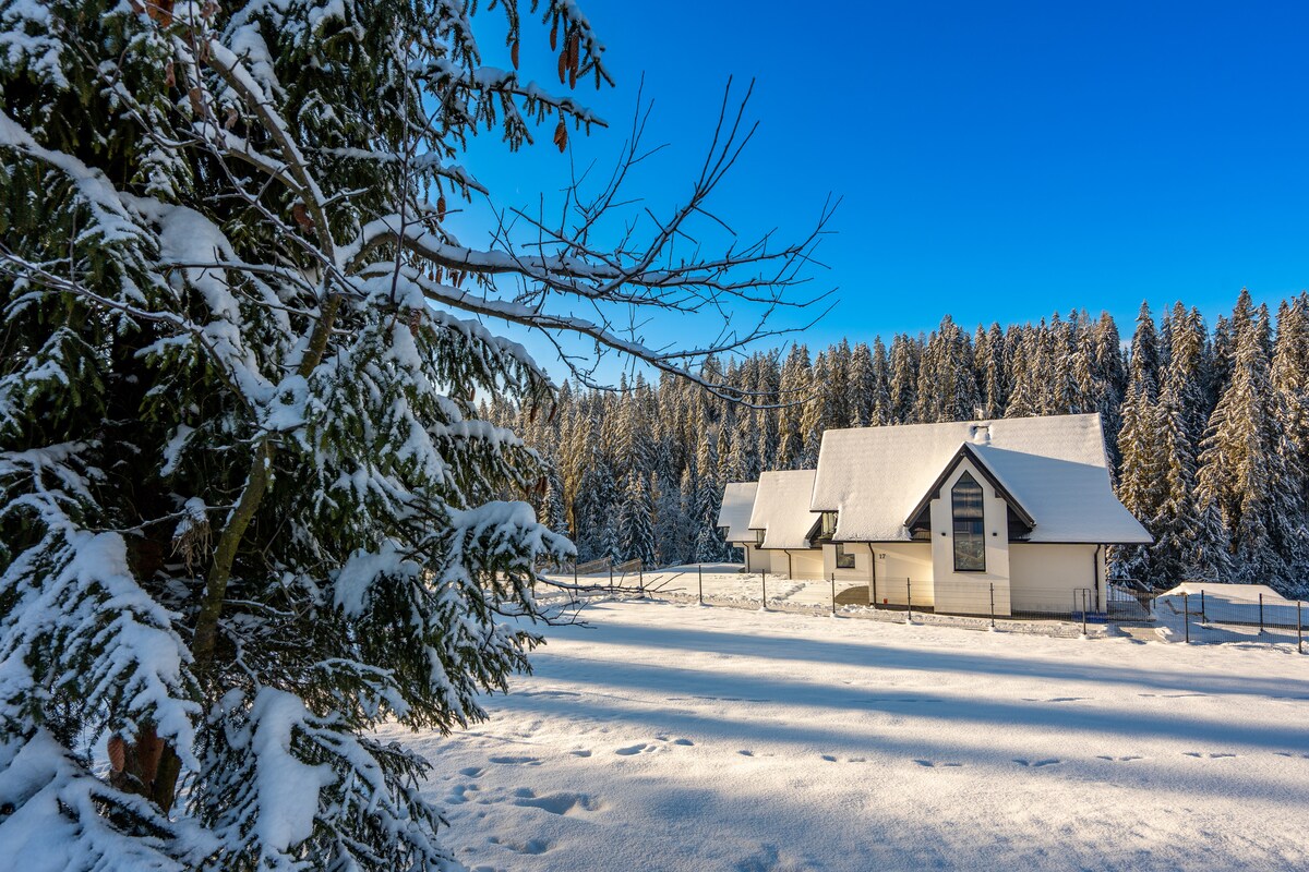 Smrekowa Ostoja es un complejo de 3 casas de campo cuya arquitectura moderna impresiona por su aspecto inusual, y gracias a su acristalamiento majestuoso, te permite disfrutar además de la vista de la naturaleza circundante. Las casas rurales se encuentran en una zona tranquila y atmosférica de Poronin llamada Jesenków. Están construidas sobre una amplia parcela, lo que es una gran ventaja para los huéspedes: ¡te permite relajarte al aire libre y acceder de forma permanente a un jardín privado durante toda tu estancia!