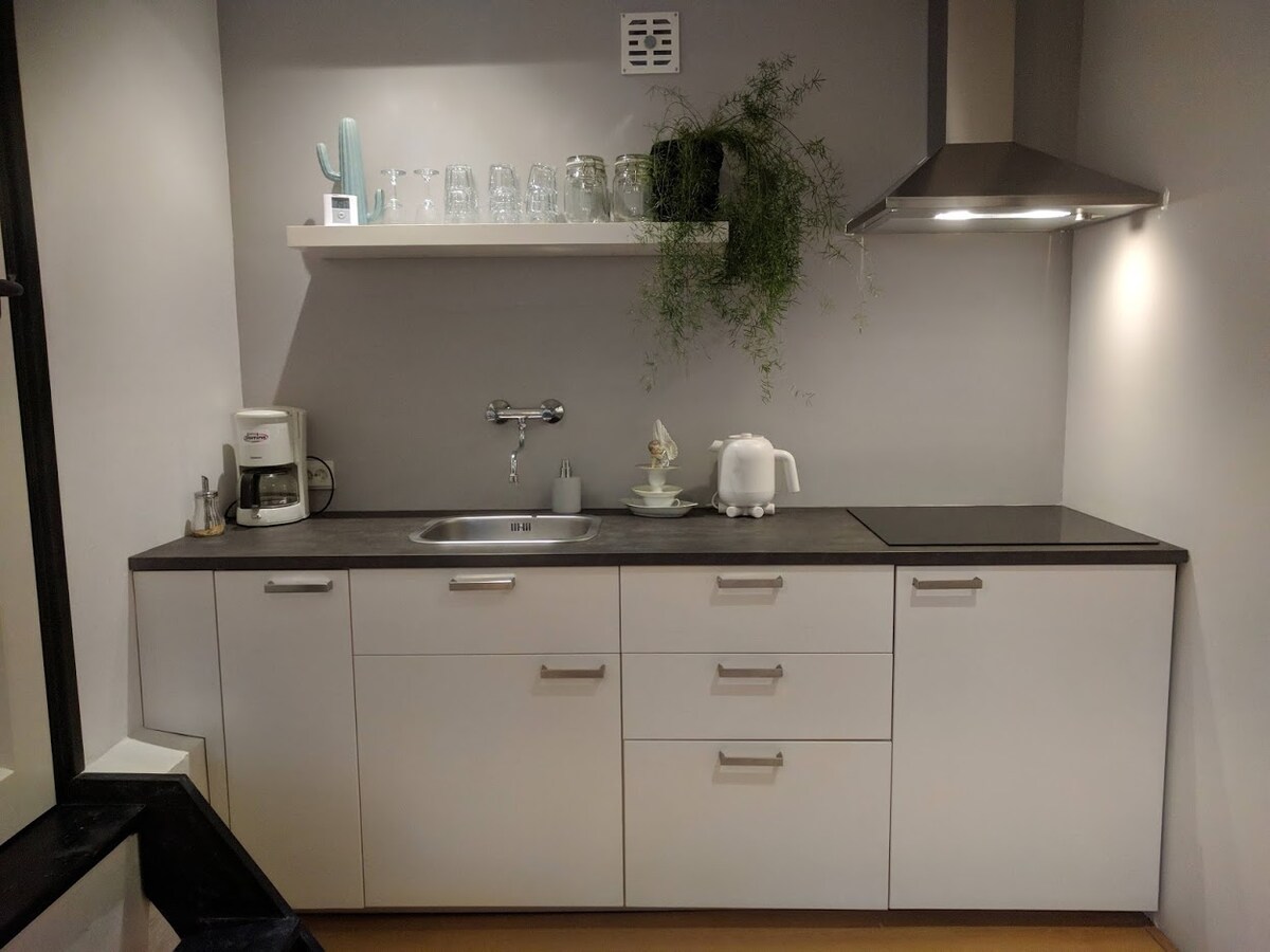 Appartement aan de achterzijde van het pand in historisch stadscentrum Franeker met eigen tuin. De tuin heeft avondzon op terras en is afgescheiden met een eigen sluitbare entree. De studio beschikt over een keuken met koelkast, inductiekookplaat, koffiezetapparaat, waterkoker en complete pannenset en serviesgoed. De badkamer heeft een ruime douche, wastafel en toilet. De studio is rustig gelegen en toch midden in het centrum met alle voorzieningen op loopafstand. 2 gratis fietsen inbegrepen.