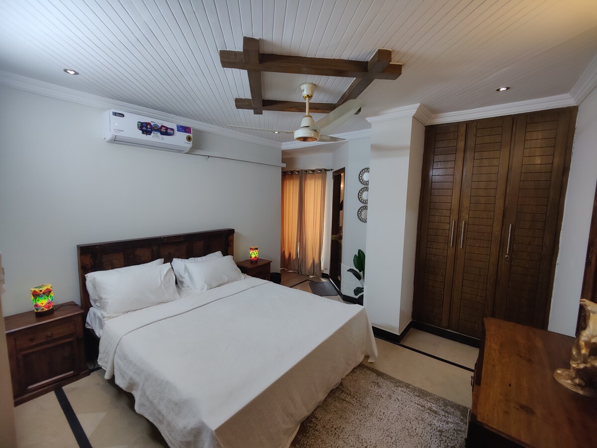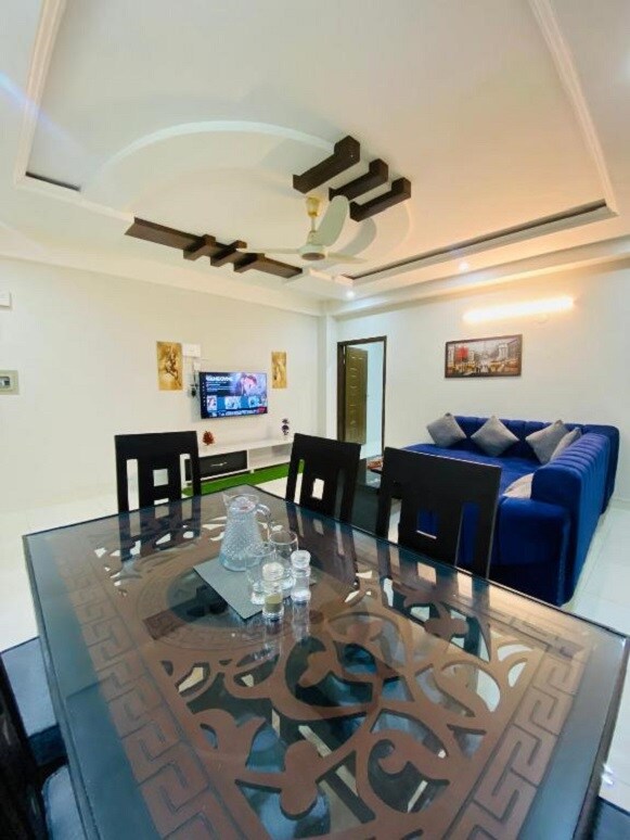 🏡 Te damos la bienvenida a THE FOUR - Apartamento familiar de 3 dormitorios Camas 🛏️ lujosas y habitaciones espaciosas 🛋️ Relajante salón y cocina moderna 🚿 Limpia los baños modernos Llegada autónoma con cerradura🔐 inteligente 📶 Wifi de alta velocidad Minibar 🧃 gratuito 🚿 Agua caliente 24/7 Ubicado en una comunidad segura y cerrada, a solo 10 minutos de todos los lugares principales de Islamabad. Este departamento totalmente amueblado es perfecto para familias que buscan comodidad y conveniencia en Isb. Se solicitará una identificación con foto/CNIC del huésped después de la confirmación.