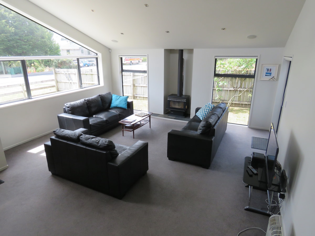 Hermosa casa de campo de estilo abierto para ustedes con una gran terraza y vistas a las montañas. Todos los dormitorios están fuera de la sala de estar principal, lo que fomenta pasar mucho tiempo en familia. A 20 metros a pie de la parada de transporte del Parque Nacional. El famoso Tongariro Crossing, el Anillo de Fuego (marzo de 2020) y el 42 Traverse son algunos de los principales eventos de la región. El Parque Nacional tiene acceso a impresionantes pistas de ciclismo de montaña y algunas de las caminatas panorámicas más bonitas de Nueva Zelanda. Cafeterías y pubs a 5 minutos a pie.