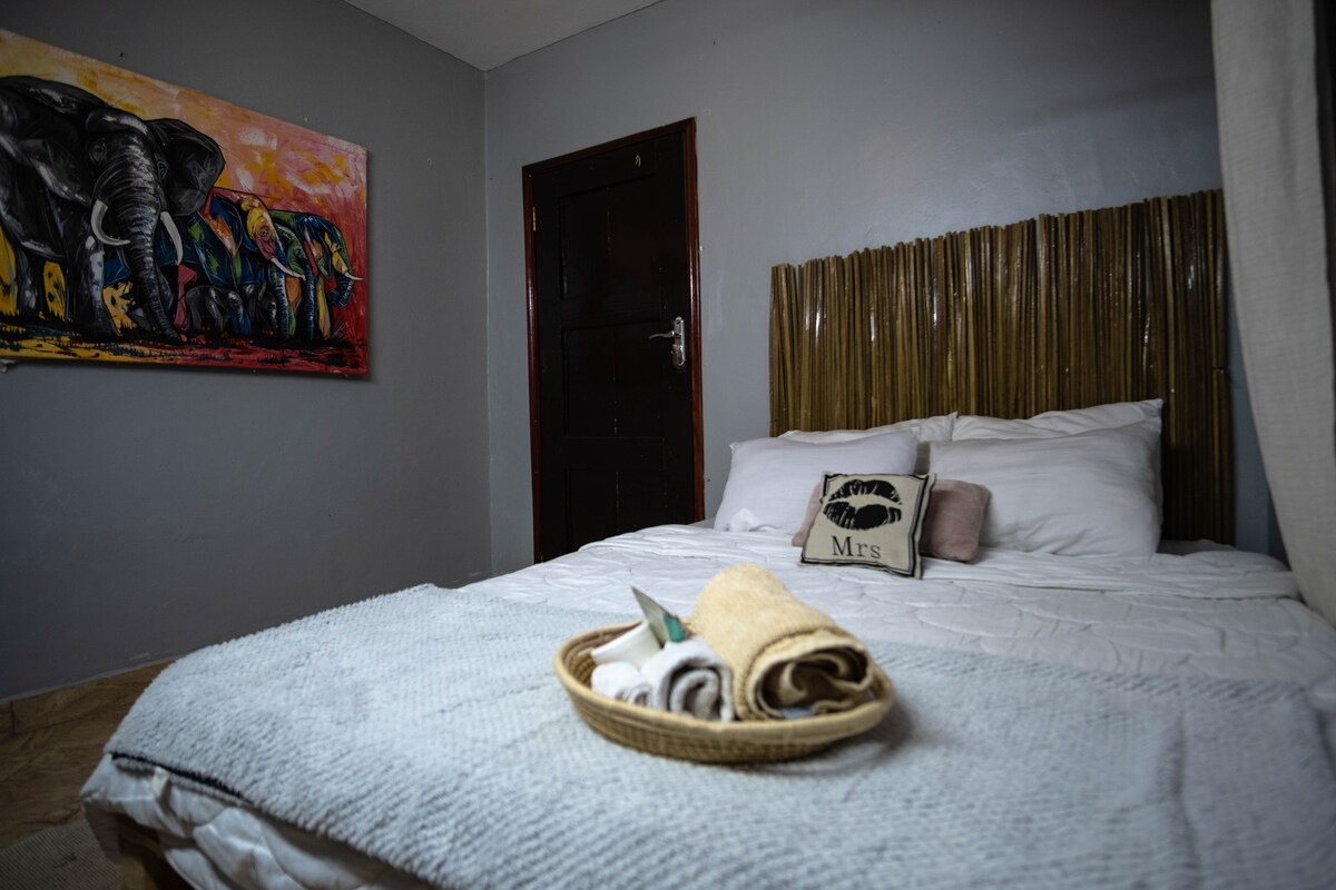 Este es un hermoso apartamento espacioso ,encantador, amueblado por estudio y con servicios en el corazón de Entebbe, justo al lado de Via Via Travel Cafe. Ofrecemos desayuno gratuito. Perfecto para escapadas de fin de semana,vacaciones. Ubicación inmejorable a solo 15 minutos del aeropuerto internacional de Entebbe. Cocina totalmente funcional, cama tamaño king, lavadora , baño privado, televisión de 65 pulgadas,Netflix y wifi inalámbrico. Aire acondicionado, guardias de seguridad las 24 horas con cámaras exteriores y un generador de espera.