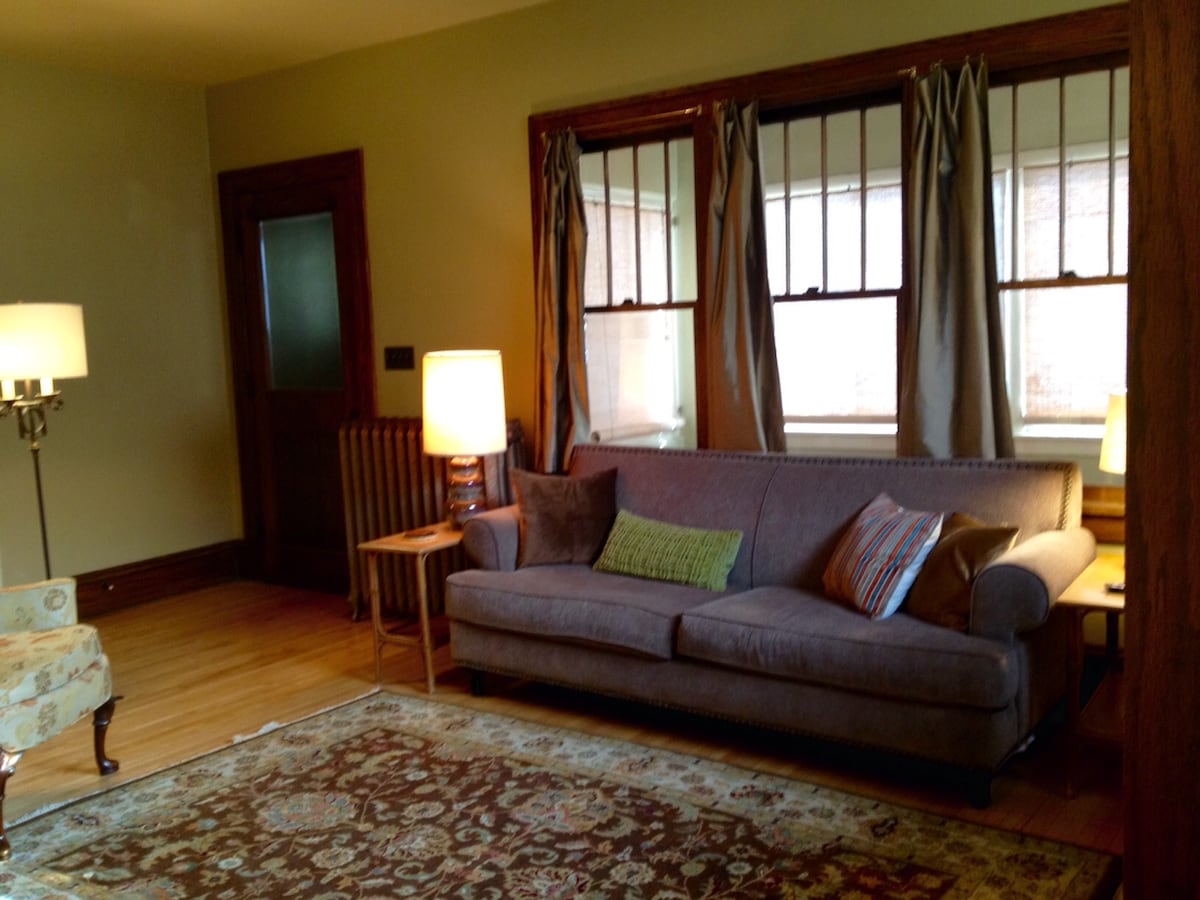 Acogedor, soleado, apartamento de nivel inferior. Barrio de primer nivel de mansiones históricas, ideal para caminar, montar en bicicleta o correr. Cocina americana totalmente equipada con encimeras de granito, lavavajillas y electrodomésticos de acero inoxidable. Espacio de trabajo dedicado y wifi de alta velocidad. La habitación adicional puede servir como segundo dormitorio privado con sofá cama extraíble. Cuarto de la colada compartido, pero por lo demás el lugar es tuyo solo con tu propia entrada. Nota: Este es un apartamento en el sótano.