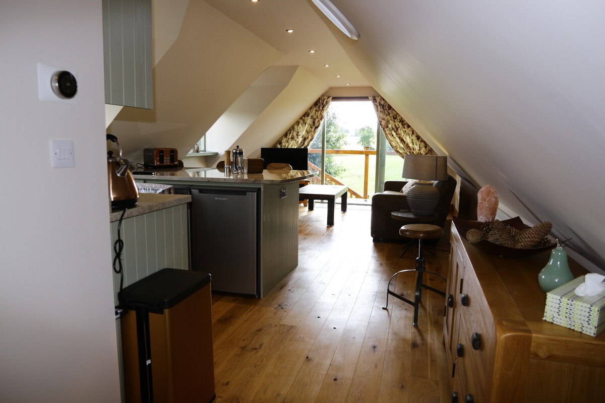 Tómate un descanso y relájate en este espacio rural tranquilo y elegante. Disfruta de pasar tiempo en un entorno de lujo, rodeado de tierras de cultivo y bonitas vistas con todos los servicios de tu hogar. Disfruta de las vistas desde tu cama tamaño king, la gran bañera independiente o el balcón Juliet. Relájate en la gran sala de estar viendo tus películas favoritas en el televisor inteligente de 75 pulgadas, wifi y sonido envolvente. Tienes una cocina equipada con cocina eléctrica con ventilador y 2 fogones para cocinar tus comidas y una mesa de comedor para comerlas.
