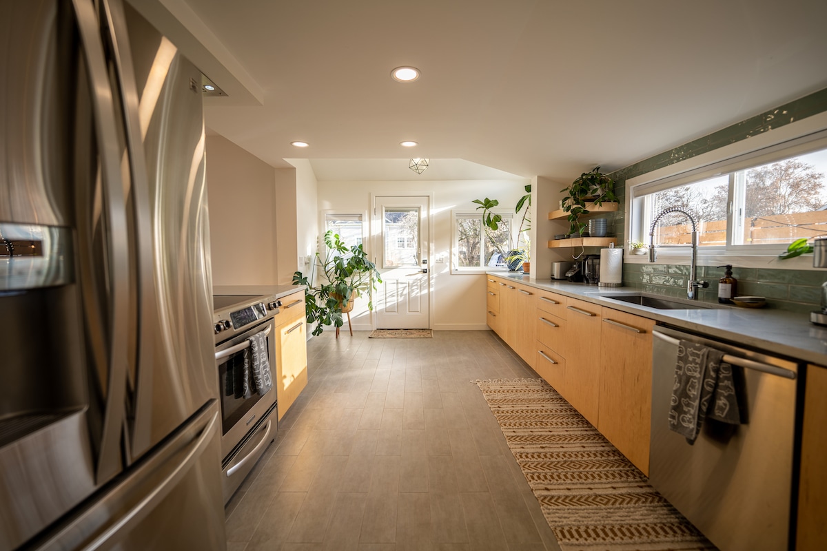 Fully renovated midcentury modern with updated conveniences. Fun and hip quality furnishings/art/ Great beds/Central Air/ Wi-Fi/LG smart T.V. Easy access ranch has wood fireplace/3 bedrooms, 2 1/2 baths/larger bedroom (queen bed) ensuite /walk in shower, two more bedrooms/queen and double/adjacent to large main bath + private 1/2 bath/laundry room / living room/dining/ chef Galley kitchen. Near beautiful Pioneer Park. Canine on approval/pet fee/fenced big yard/off street covered parking.