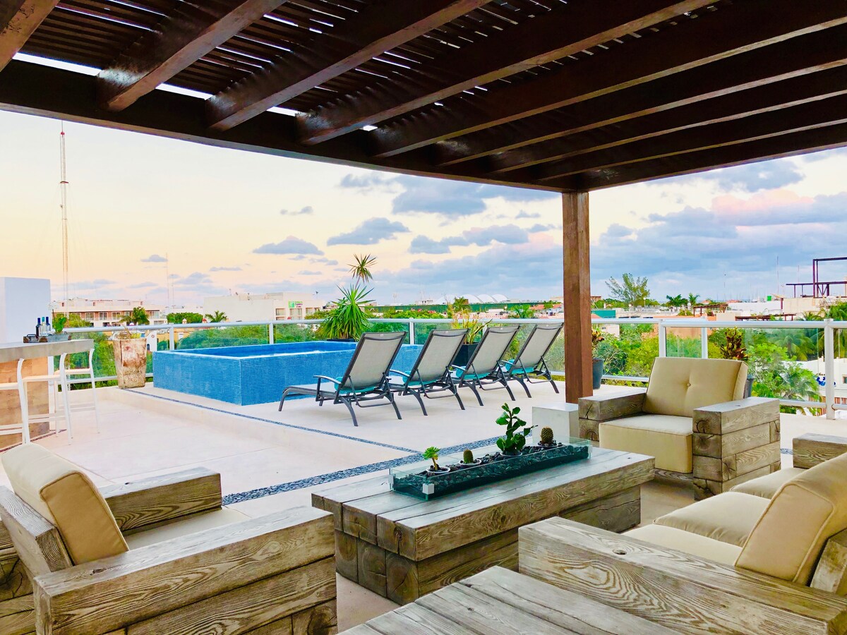 😎 Beautiful panoramic ocean views from one of the most stunning rooftop pools in Playa del Carmen where the ocean is only steps away from the location. Spend endless hours soaking up the sun while gazing out into the turquoise blue. We also have a fitness center with great views of the ocean which you will enjoy while working out. cuna y silla de bebe esta sujeto a disponibilidad 🌊
