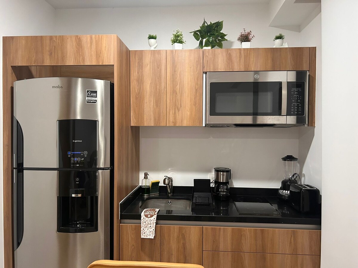 Modern loft perfect for two. It is an open style condo- hotel loft. The bedroom with a super comfortable king size bed, a flat screen TV, and a dresser. The kitchen has a high bar, three comfortable seats, a fridge, microwave, toaster, blender, coffee maker and a water kettle. The bathroom is spacious with the perfect lighting. There’s a small terrace outside the room with chairs. On the roof top you can enjoy the pool, gym and multifunctional room with a TV and books.